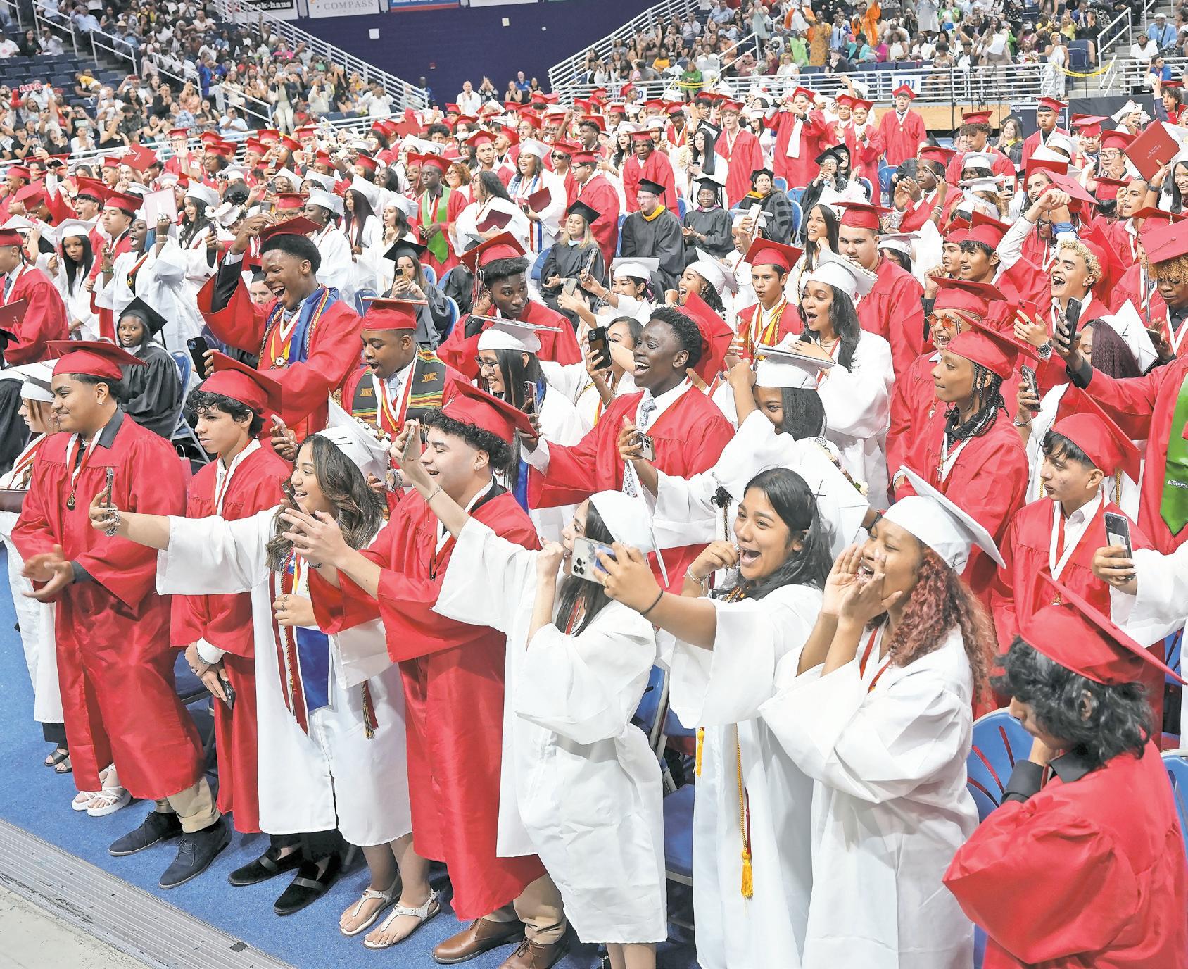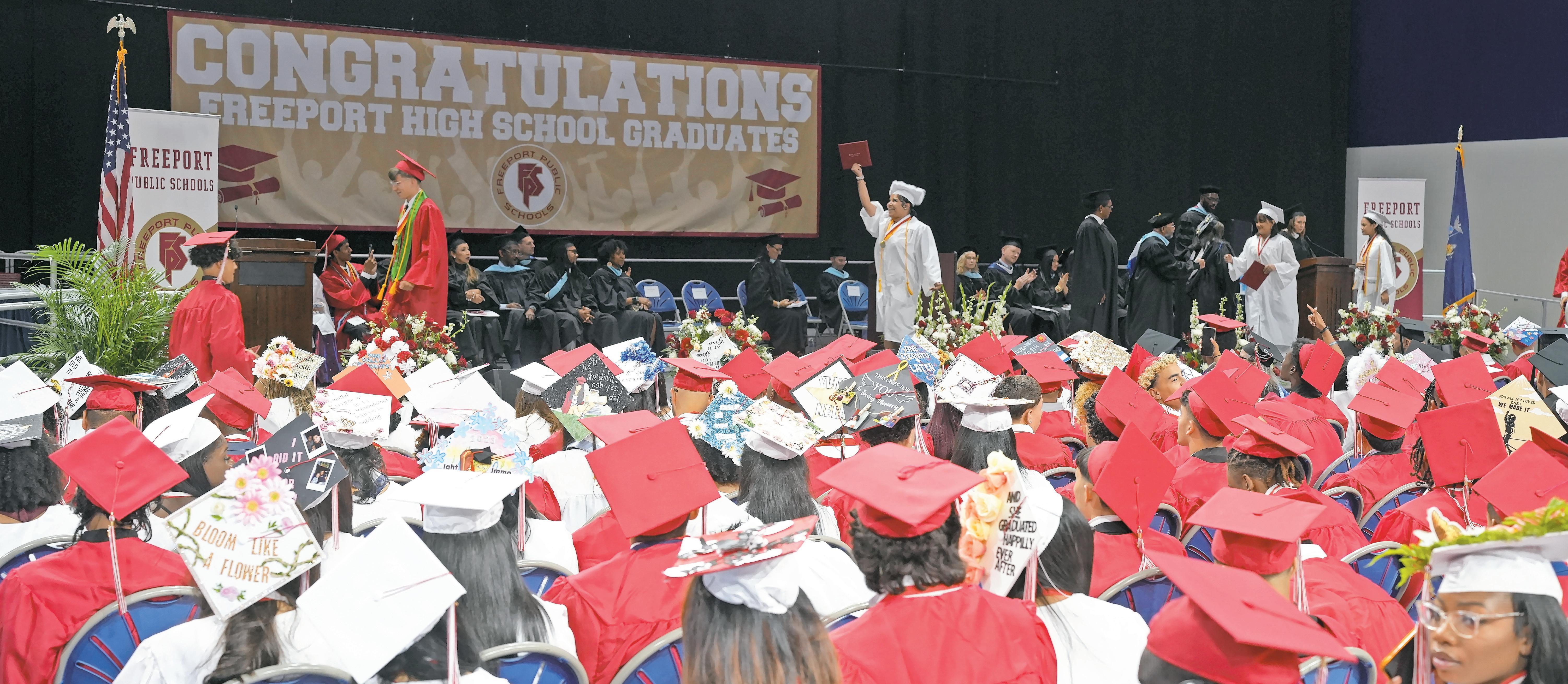 It all took place on June 17 at the Dave S. Mack Sports and Exhibition Complex at Hofstra University, where the Class of 2023 accompanied by Superintendent Kishore Kuncham, district administrators, the education board, and high school Principal Gisselle Campbell-Ham made a grand entrance to the traditional “Pomp and Circumstance.”
