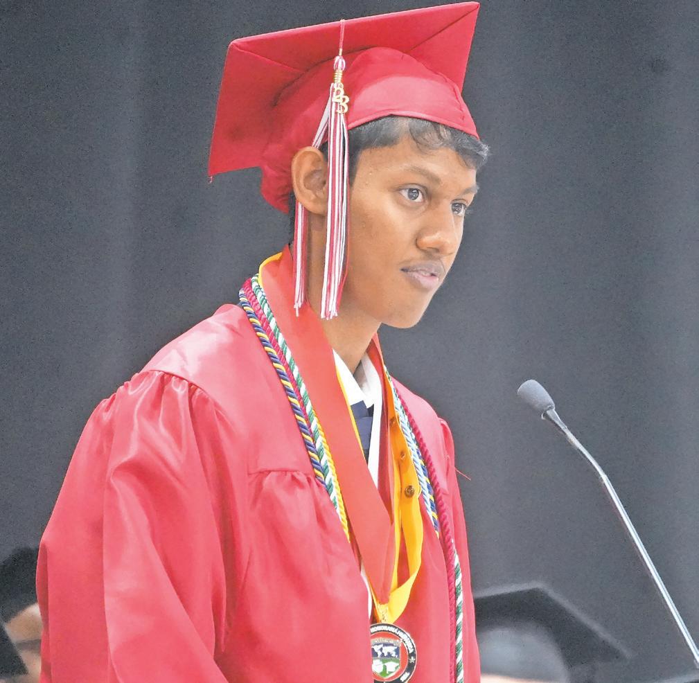 Valedictorian aidian SaSenarine addresses his fellow graduates, emphasizing the importance of embracing challenges and expressing gratitude during the momentous Freeport High School Commencement Ceremony.