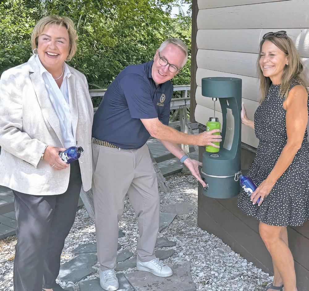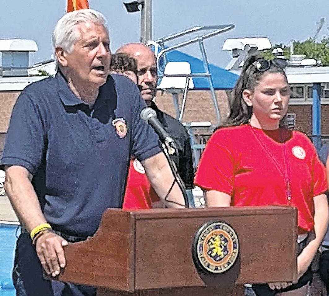 Charles Shaw/Herald County Executive Bruce Blakeman joined county Police Commissioner Patrick Ryder and supermarket chain executive Stew Leonard Jr. to discuss water safety at a news conference at Wantagh Park Pool on June 25.