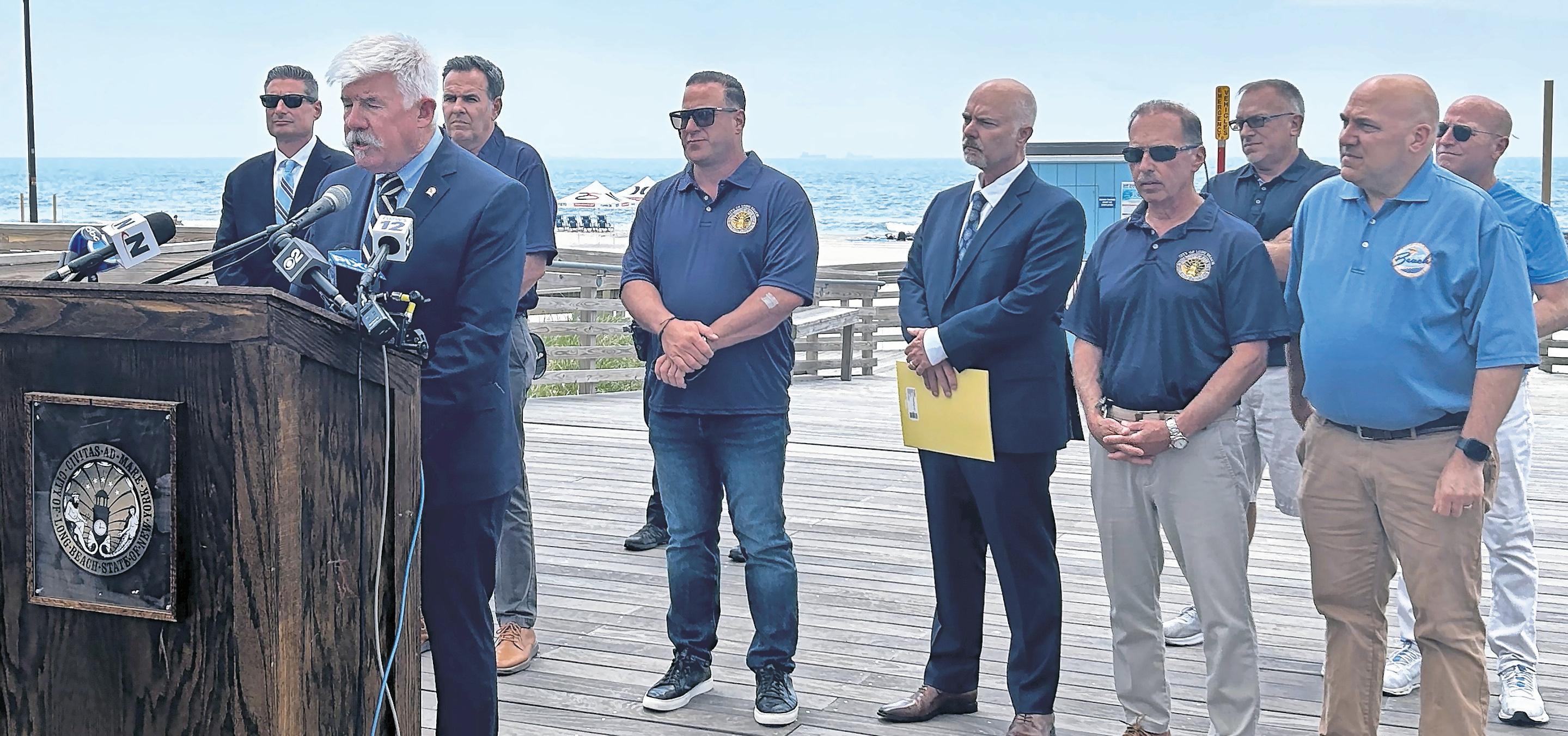 City officials held a news conference on June 14 on the boardwalk at Riverside Boulevard, announcing immediate changes to beach access rules in the wake of an unexpectedly large gathering on the beach and a shooting at the Long Beach train station the previous day.