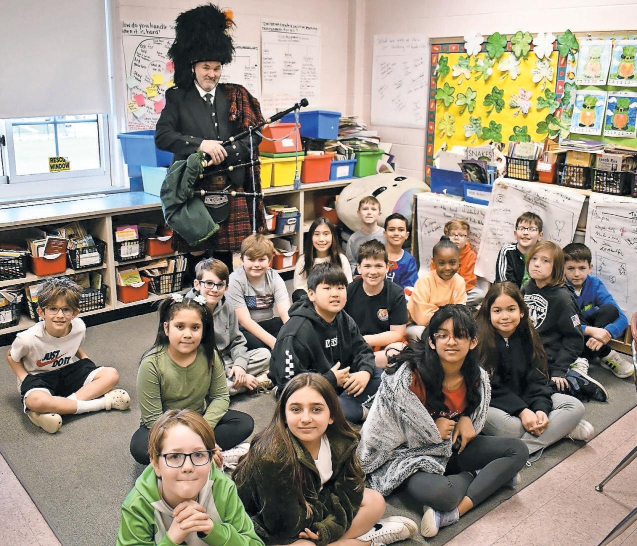 visited the fourth graders and taught them about the history of bagpipes, what all the parts are called, and about the traditional outfit, including how your family name determines what color your kilt — or balmoral — should be.