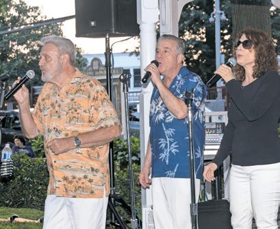 Band members Eddie Genninger, left, Sal Ferraro, and Camille Saturday sang in harmony during the concert at the Malverne gazebo.