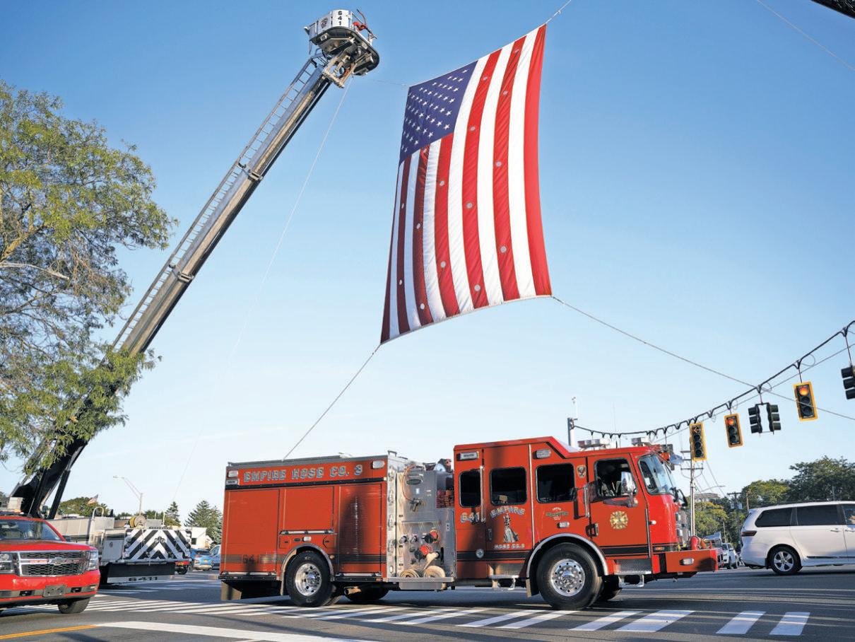 In Merrick, the ceremony is perhaps best known for the massive American Flag, that is hung parallel to Sunrise Highway, often grabbing the attention of many passersby, who honk in support of the department.