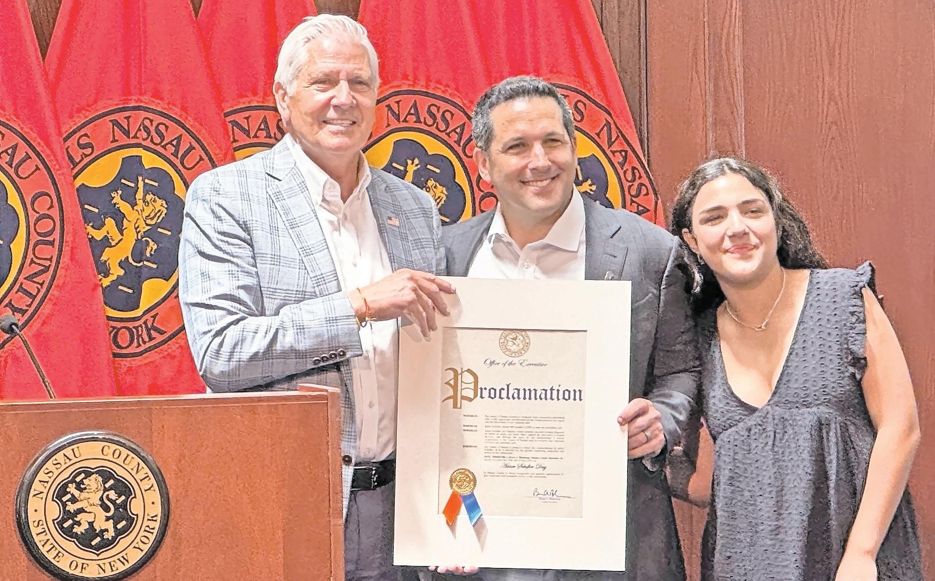 adam Schefter, center, with his daughter, dylan, and County executive Bruce Blakeman.
