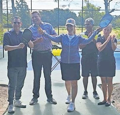 Lawrence village Trustee Aaron Parnes, left, Lawrence Country Club General Manager Kevin Dudleston, Deputy Mayor Tammy Roz, club Head Tennis Professional Shabir Mohammed and Vice Chairman of Park Advisory Board Carolyn Argento, enjoy the new pickle ball court.