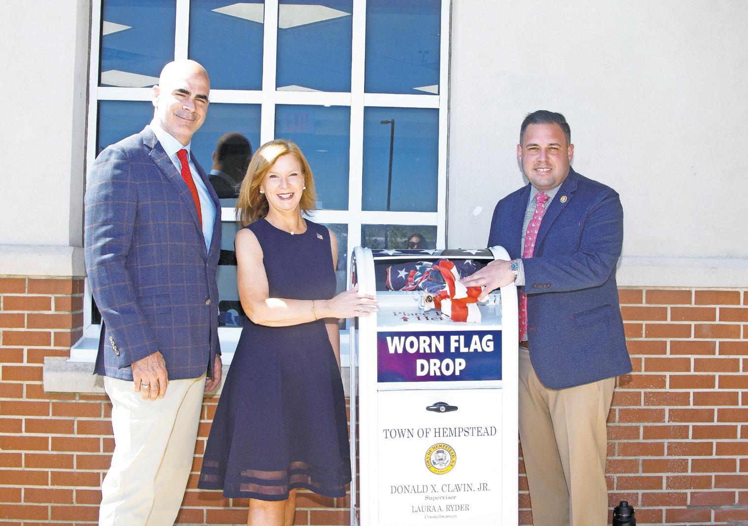 Island Park village Trustee Barbara Volpe-Ried joined Congressman Anthony D’Esposito, Councilwoman Laura Ryder, and Legislator Patrick Mullaney as local scouts raised a new flag over the village Library. During the ceremony, Councilwoman Ryder presented the library with a worn flag drop box.