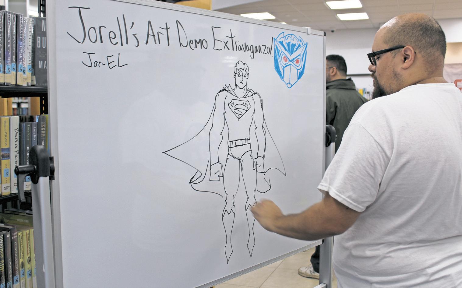 JORell RIVeRA sketches out Superman, teaching eager youngsters how to draw characters.