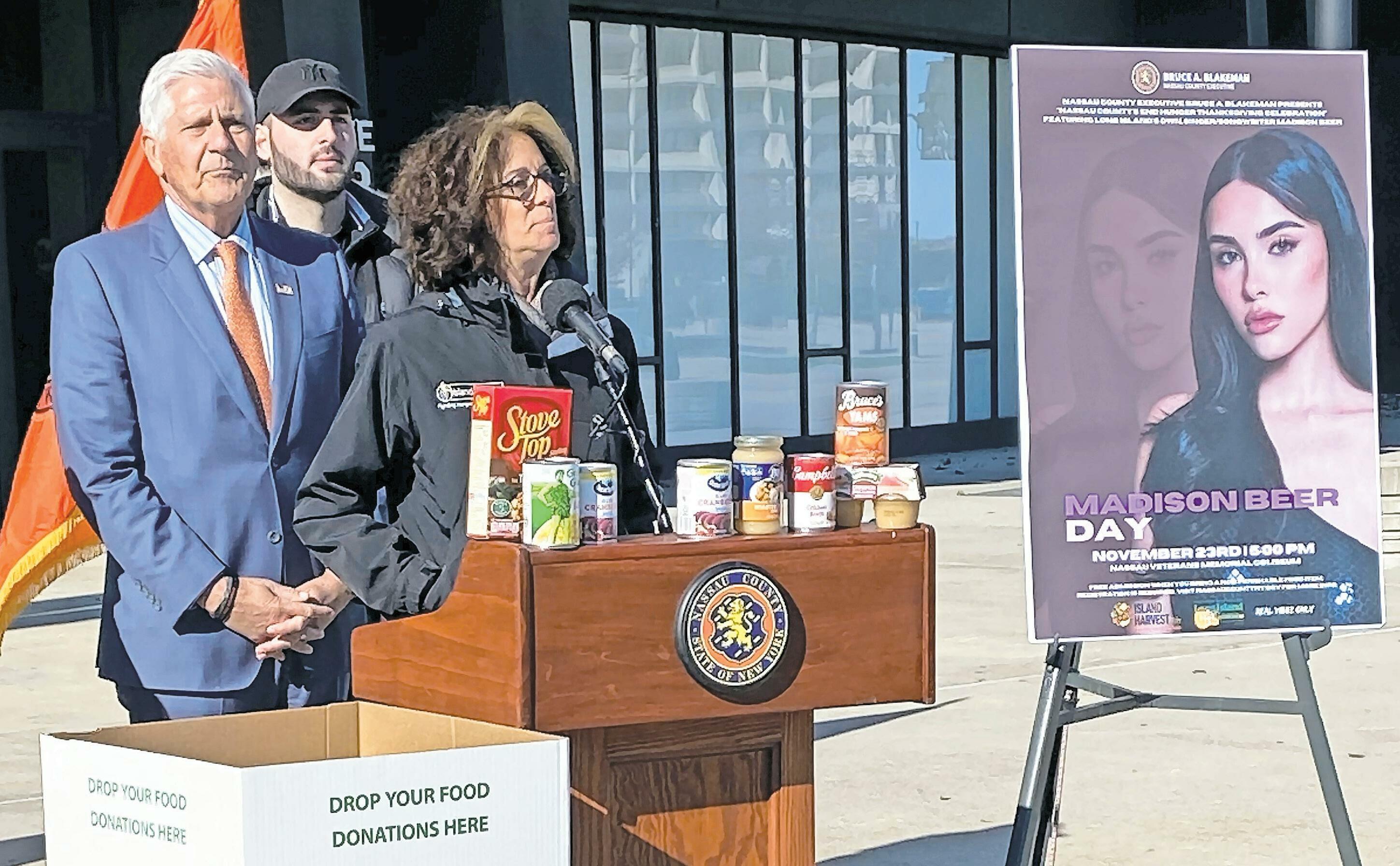 RANdI ShuBIN dReSNeR, the president and chief executive of Island Harvest, thanked Nassau County Executive Blakeman for including her organization and Long Island Cares in the ‘End Hunger Thanksgiving Celebration.’ The free event — set for Wednesday, Nov. 23 — will be hosted by Long Island-born singer-songwriter Madison Beer, and will double as a food collection drive.