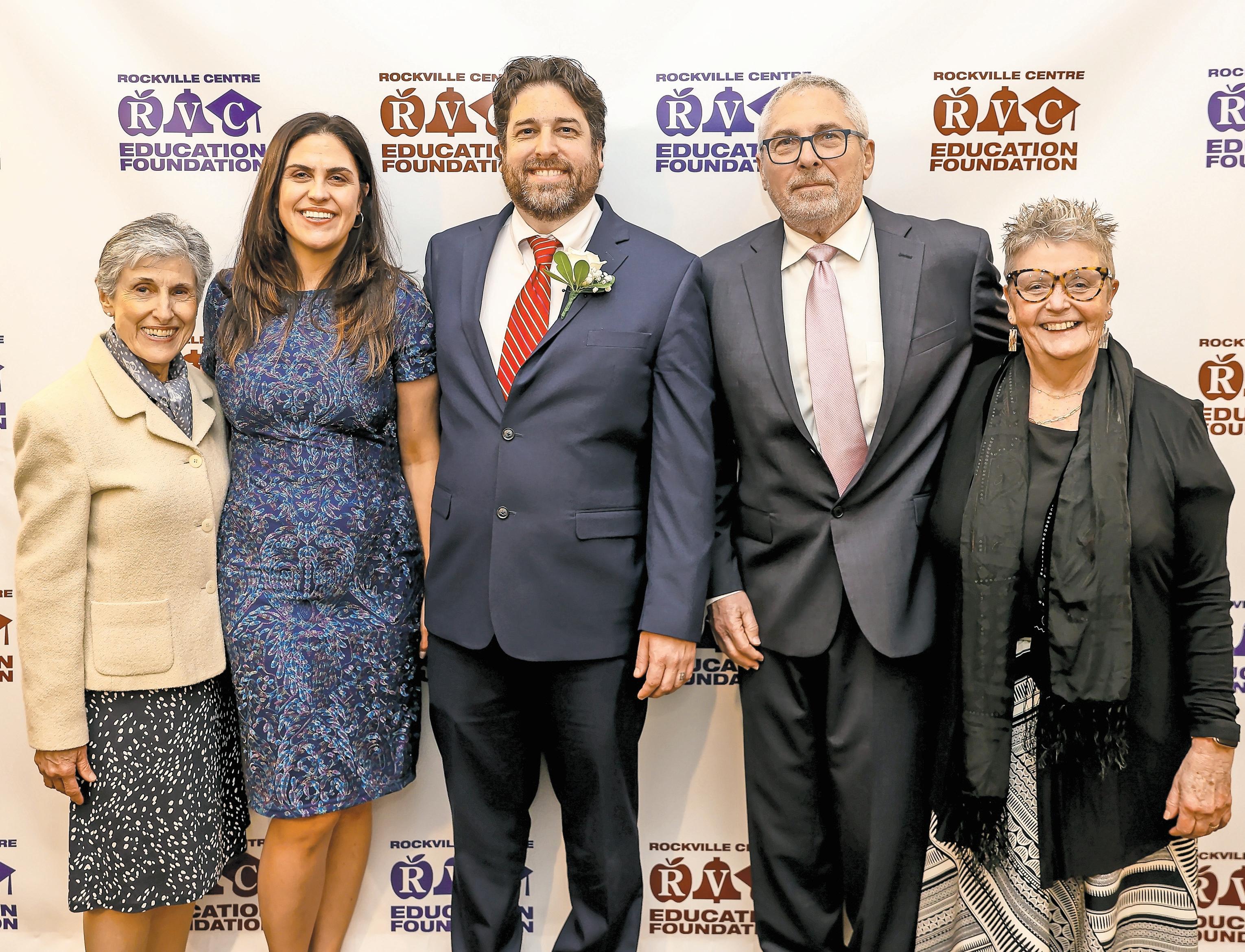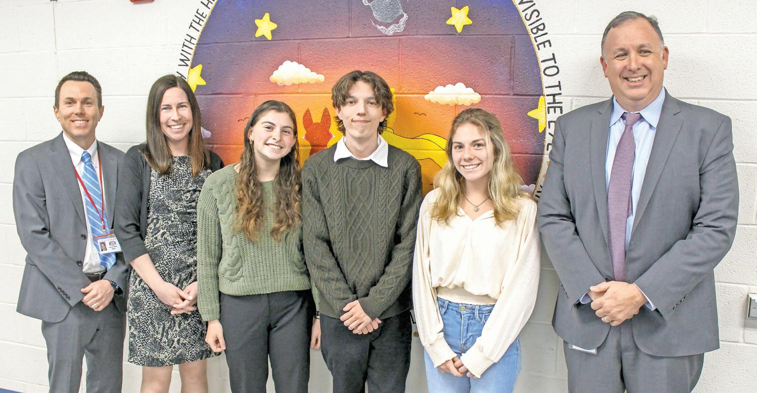 Courtesy Rockville Centre school district South Side PrinciPal Patrick Walsh, far left, with Board of Education President Kelly Barry, Co-valedictorian Samantha Stein, National Merit Scholar Matt Downing, Co-valedictorian Cameron Coletti and Schools Superintendent Matthew Gaven.