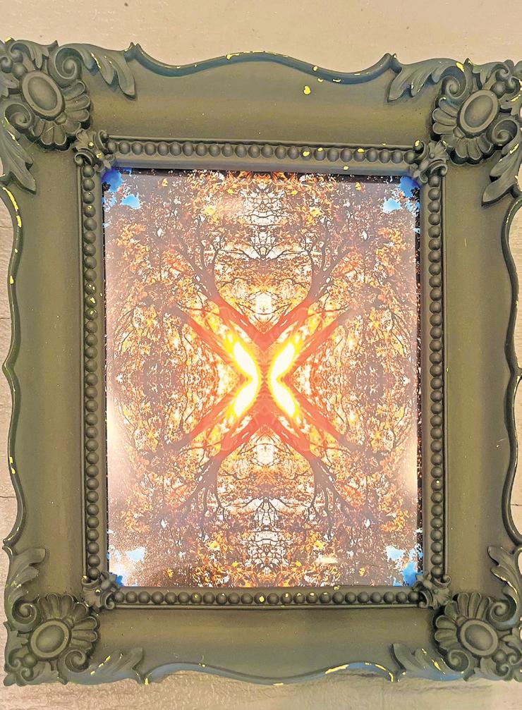 Dixon’s mandalas, not much larger than an Instagram picture, beckon the viewer to lean in. Each thick frame centers a vibrant image of treetops or cityscapes layered and mirrored over itself, invoking images of stained glass churches or an alien skyline. They are unique, no two photographs comprised of the same source photo, as Dixon said that each piece was made fresh for this exhibit. Magnifying glasses will be passed around for audience participation.