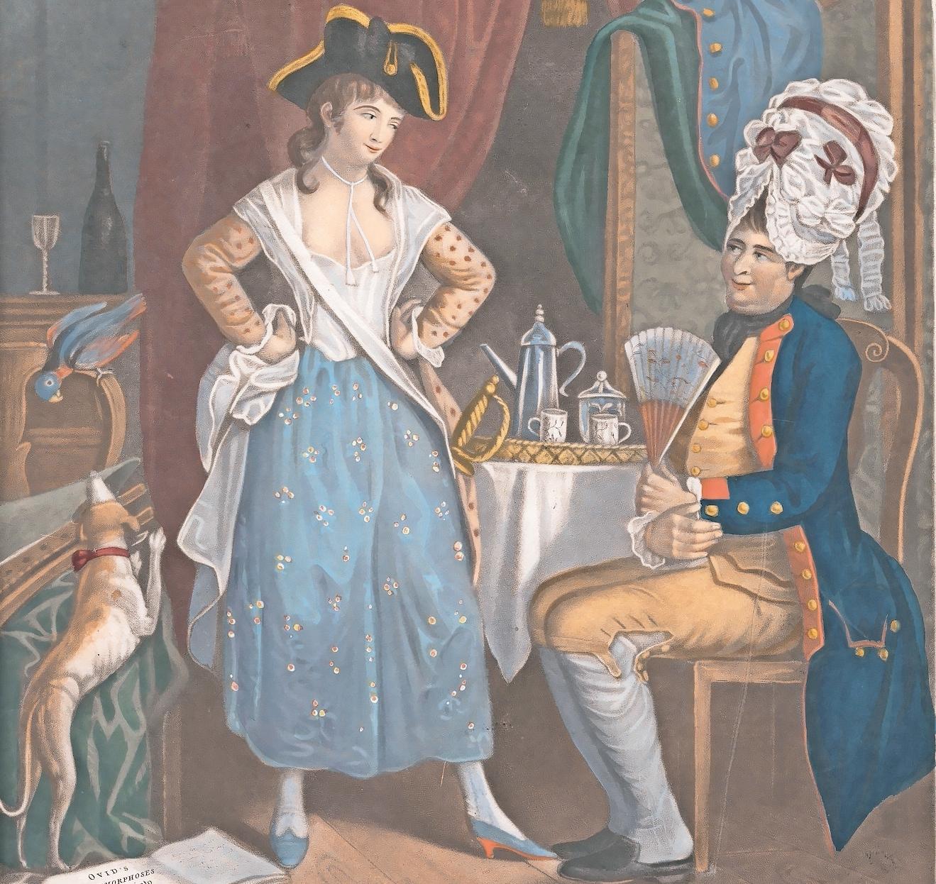 Molly houses often provided opportunities for people to flaunt or subvert traditional gender norms and roles, as this cartoon from 1780 shows.