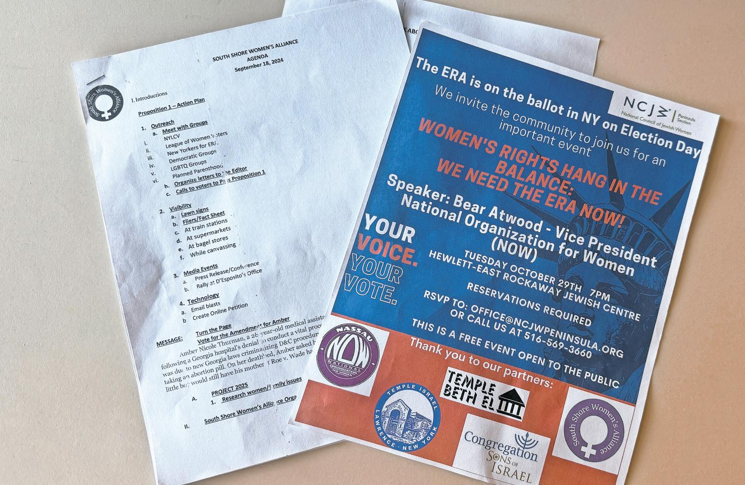 during the re-establishment meeting of the South Shore Women’s alliance, fliers were distributed outlining the group’s goals in anticipation of the upcoming election. the alliance plans to advocate for the passing of proposition 1, which will be on new York ballots in november.