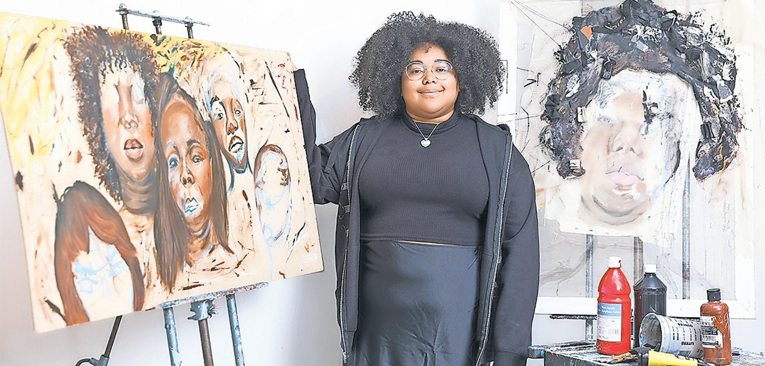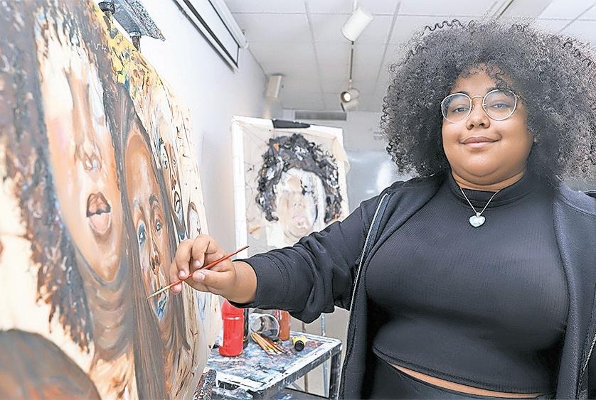 Hofstra student and artists Beauvoire Jean-Charles working on her paintings for the Journey to Joy art show