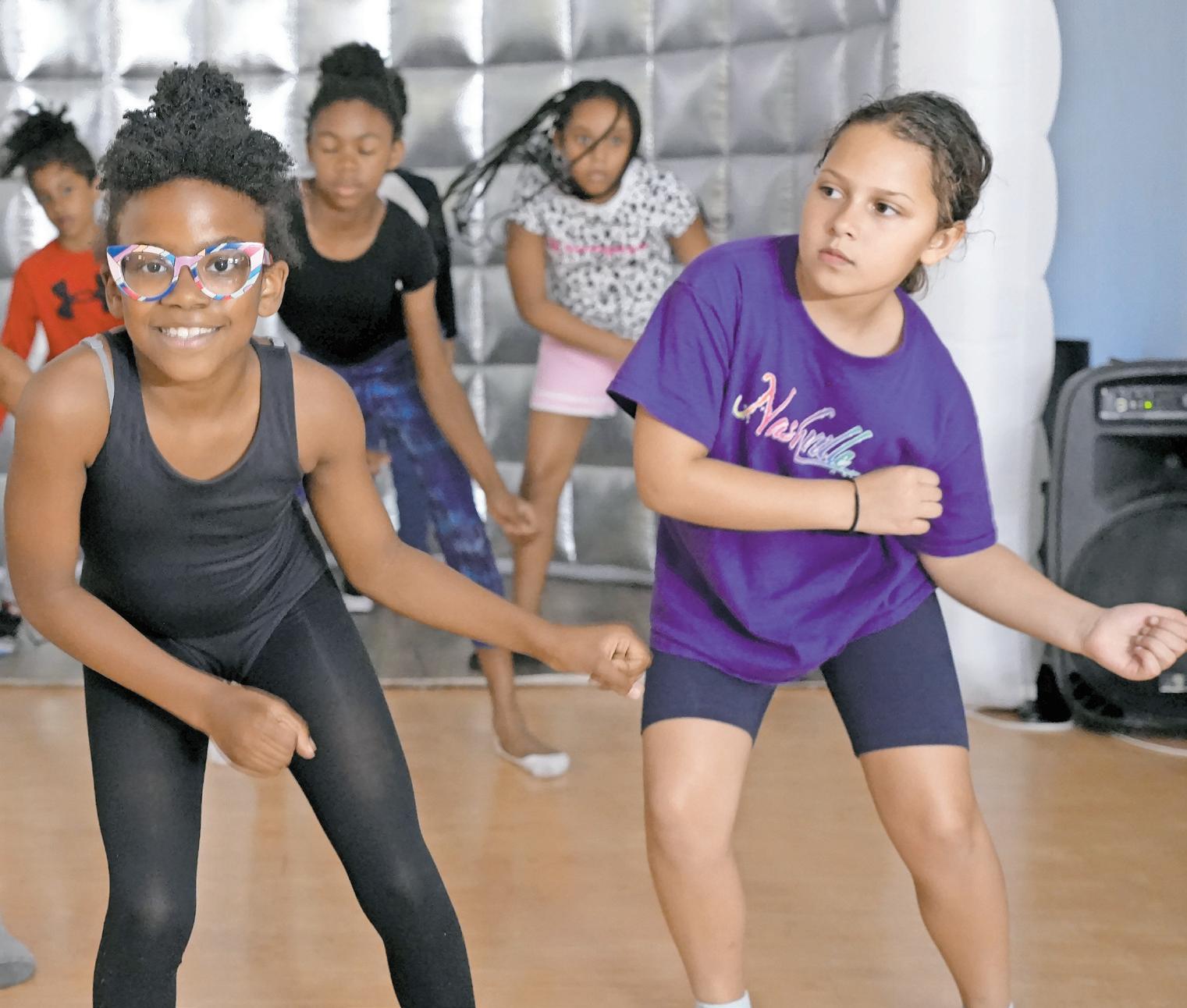 Tim Baker/Herald eight-yeAr-old lAity thiAM, of Baldwin, left, dances it out with her classmates at Layla’s Dance & Drum in person after the studio was forced to close its doors during the pandemic.