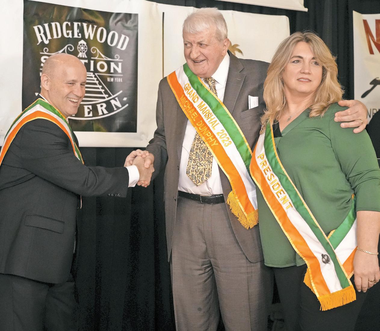 nassau countY police Commissioner Patrick J. Ryder, left, shakes hands with Michael Dunphy. At right is Wantagh Chamber President Cathy McGrory Powell. Ryder was the longest-serving grand marshal, having been named to the position for the 2020 parade, which was cancelled due to the pandemic. The torch has now officially been passed to Dunphy, owner of the Wantagh Inn.
