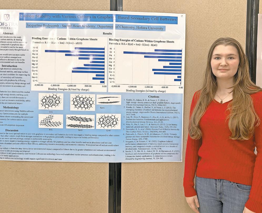 For her second article, Bodycomb researched better alternatives to lithium-ion batteries. She conducted her work last summer at Hofstra University’s chemistry lab as part of her senior thesis, using software to simulate the effectiveness of other alternate sources. The inspiration, she said, came from real-life news reports of electric vehicle incidents.