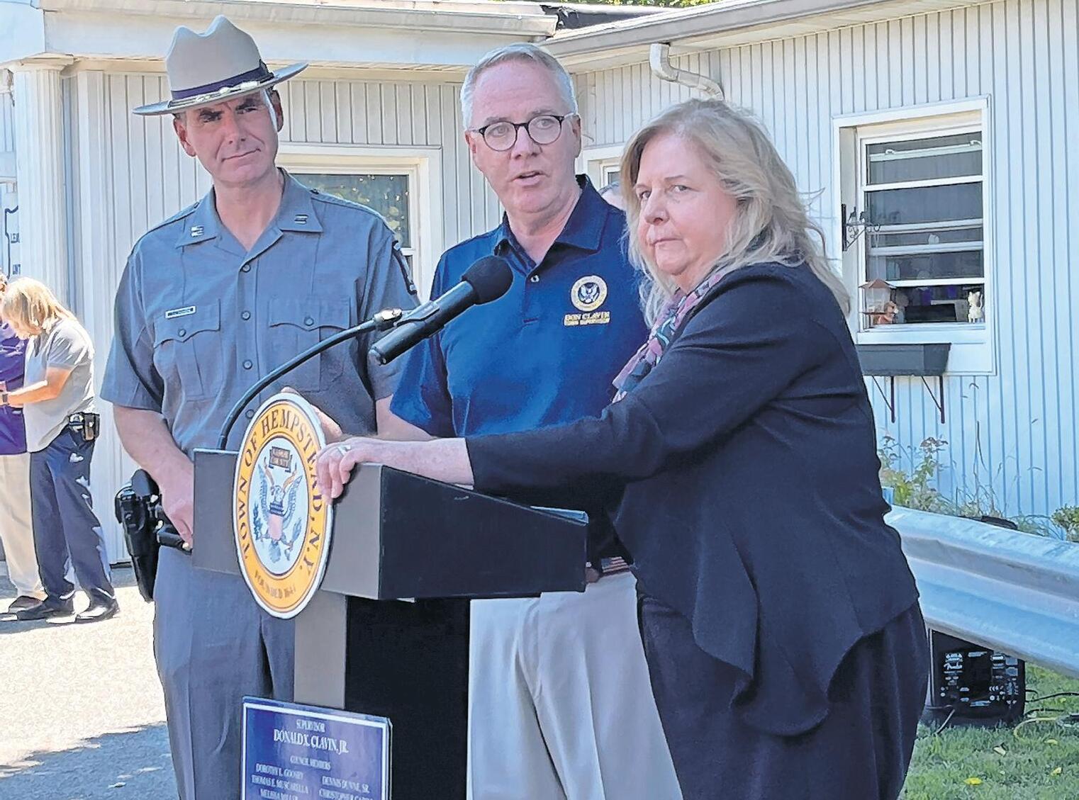 town Supervisor don Clavin, center, joined nassau County district attorney anne donnelly and State police Capt. timothy gleason at the town of Hempstead animal Shelter in Wantagh on July 3 for an update on roxi and the investigation into her abandonment.