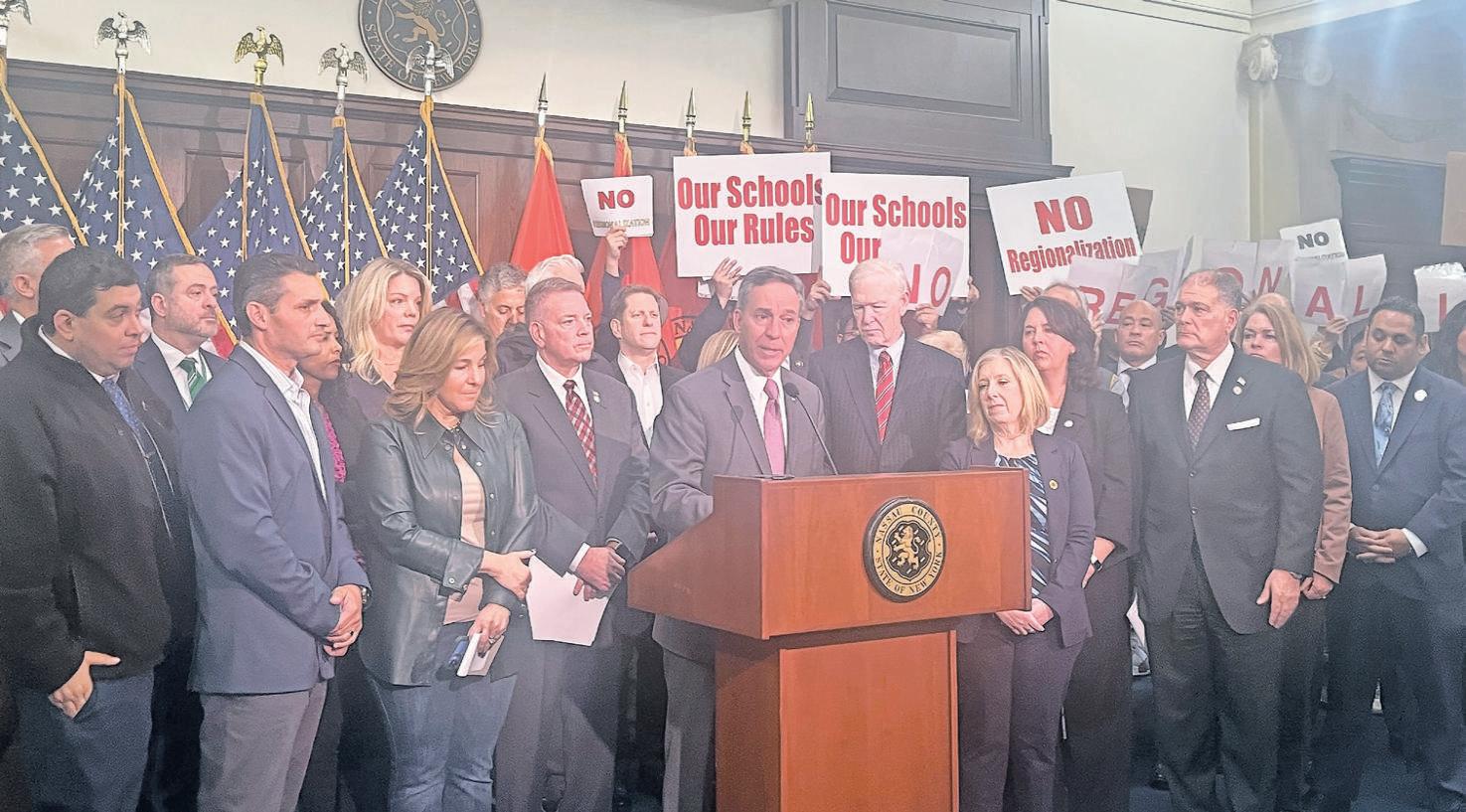 During a news conference at the Bethpage Train Station on Nov. 19, Republican state senators, including Steve Rhoads, Jack Martins and Patricia Canzoneri-Fitzpatrick, joined Steamfitters Union Local 638, the