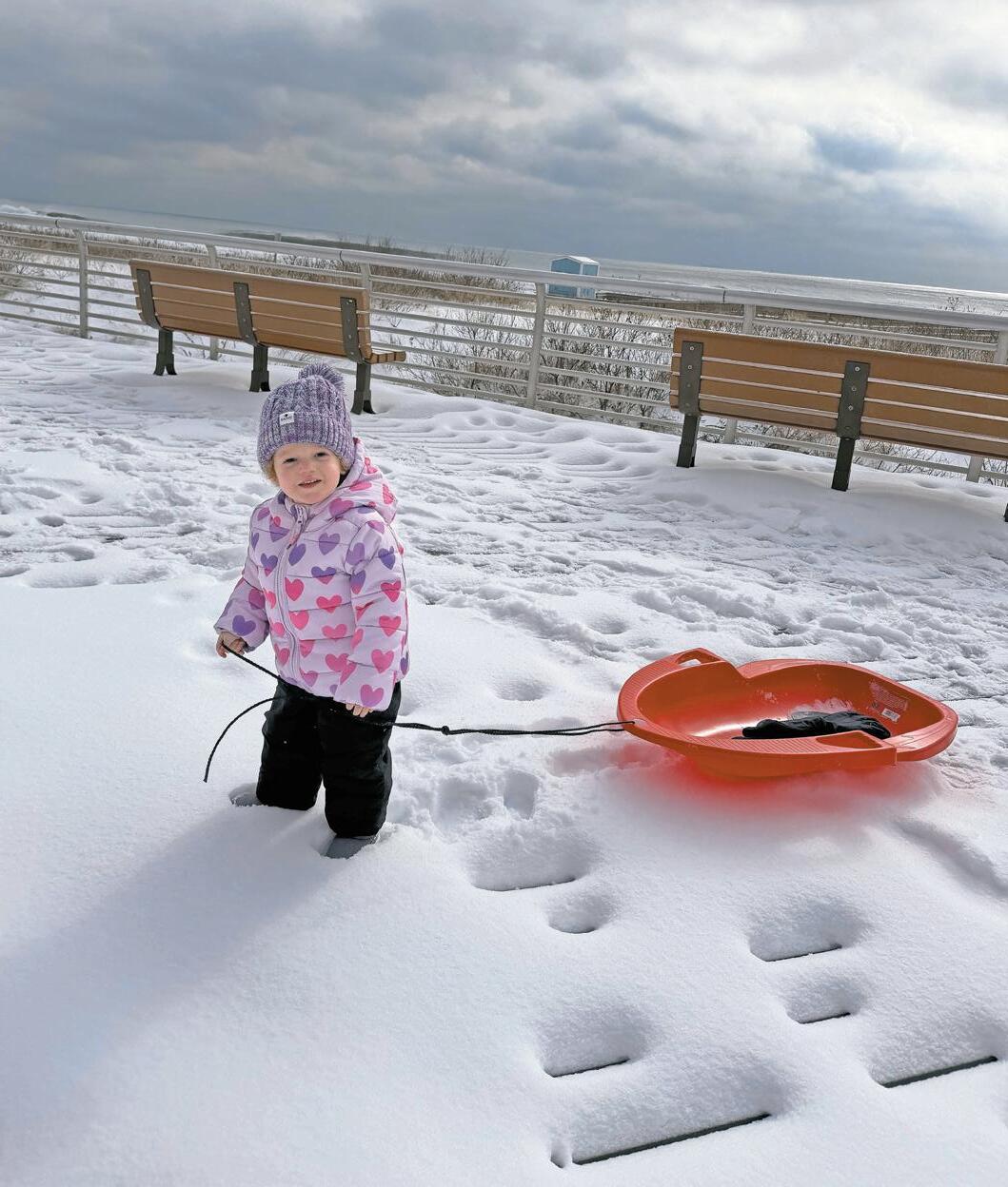 For the better part of three days, maintenance crews were clearing dangerous roads, plowing nearly a foot of snow in temperatures far below freezing. With schools shut down to start the week, the frigid weather didn’t stop 2½-year-old Riley Rothman from enjoying sledding time with her mom on the boardwalk.