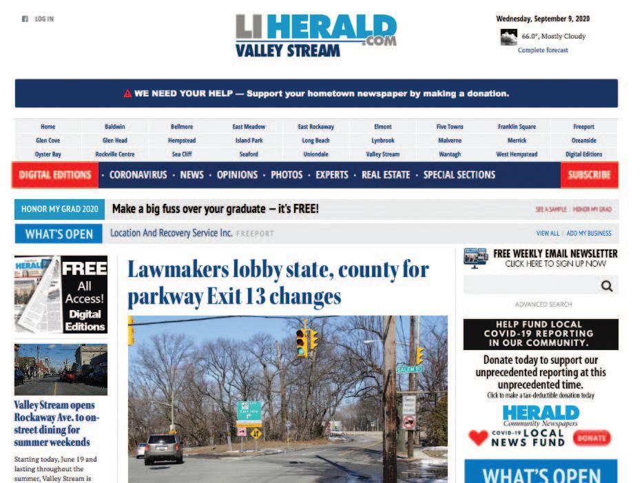 Between the village’s website, Facebook page and community social media — plus, the Herald’s recently revamped news site that delivers breaking and in-depth, hyper-local news — Valley Stream has a strong online presence to keep community members up to date. There is no shortage of opinions, ideas and a dash of discourse in the community, whether it’s politics or quality-of-life issues. We encourage you to check out our list of noteworthy, local online links that residents might fi nd useful and interesting: Your local Herald news Liherald.com/valleystream Facebook.com/vsherald Village of Valley Stream http://www.vsvny.org/ Schools http://www.valleystream13.com/ http://www.valleystreamschooldistrict24.org/ http://www.valleystream30.com/ http://www.vschsd.org/ Chamber http://valleystreamchamber.org/