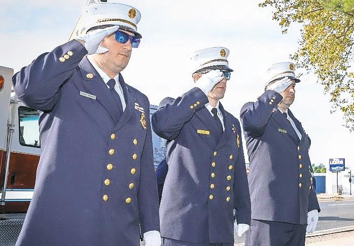 Lynbrook Fire Chief Clayton Murphy, far right, First Assistant Chief James DiGiambattista, and Third Assistant Chief Phil Tzacz salute after a wreath was placed at the Firefighters Memorial on Sunrise Highway during the department’s annual memorial service on Oct. 19. The ceremony honored six Lynbrook firefighters who died in the line of duty between 1932 and 1963.