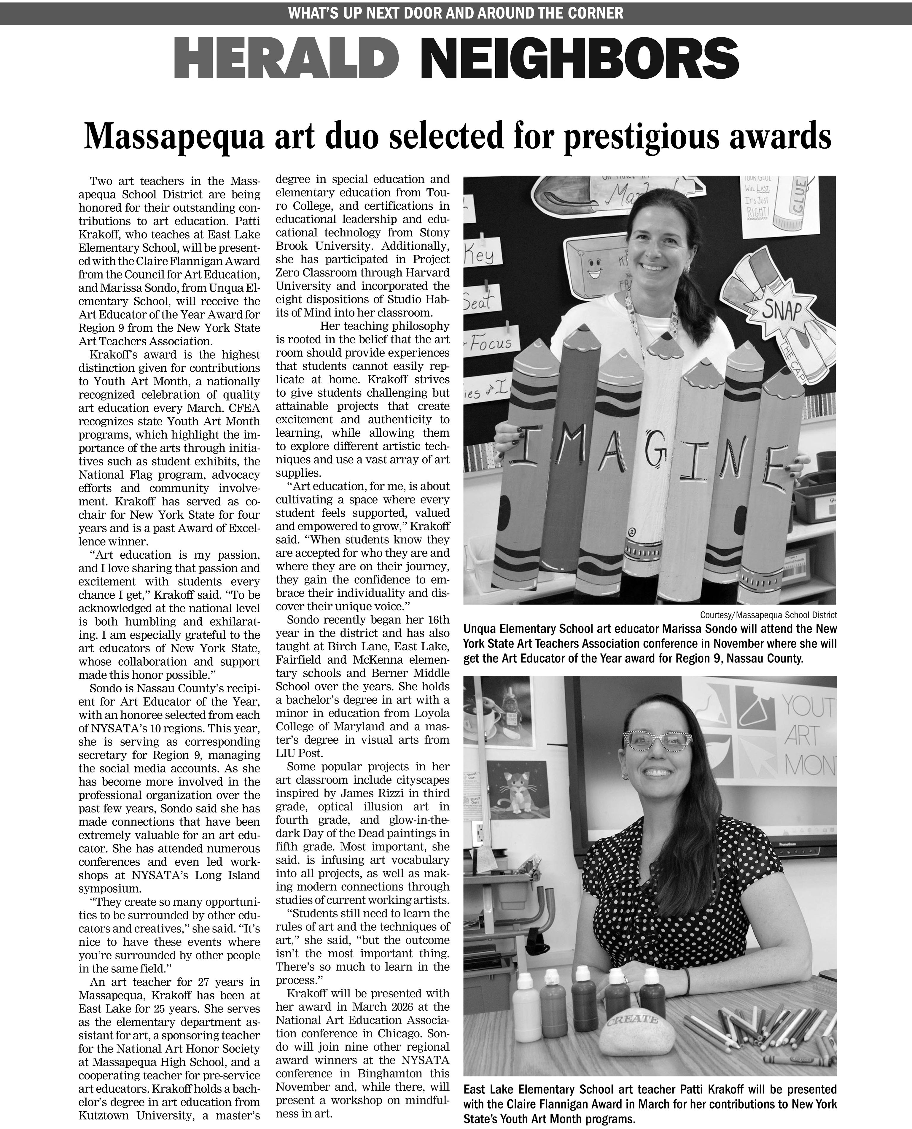 • Massapequa students James Benjamin and Tatum Brennan awere appointed by the school board as ex officio members of the Board of Education for the 2025-6 School Year. James and Tatum will attend board meetings to provide updates on student accomplishments and activities at Mass-