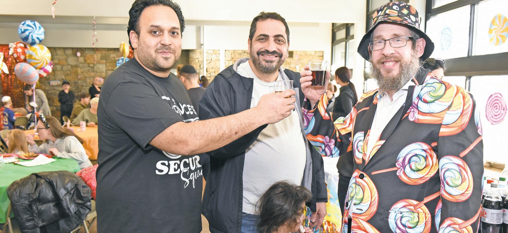 Cheers for Purim! Aaron Polansky, David Nanal and Rabbi Kramer.