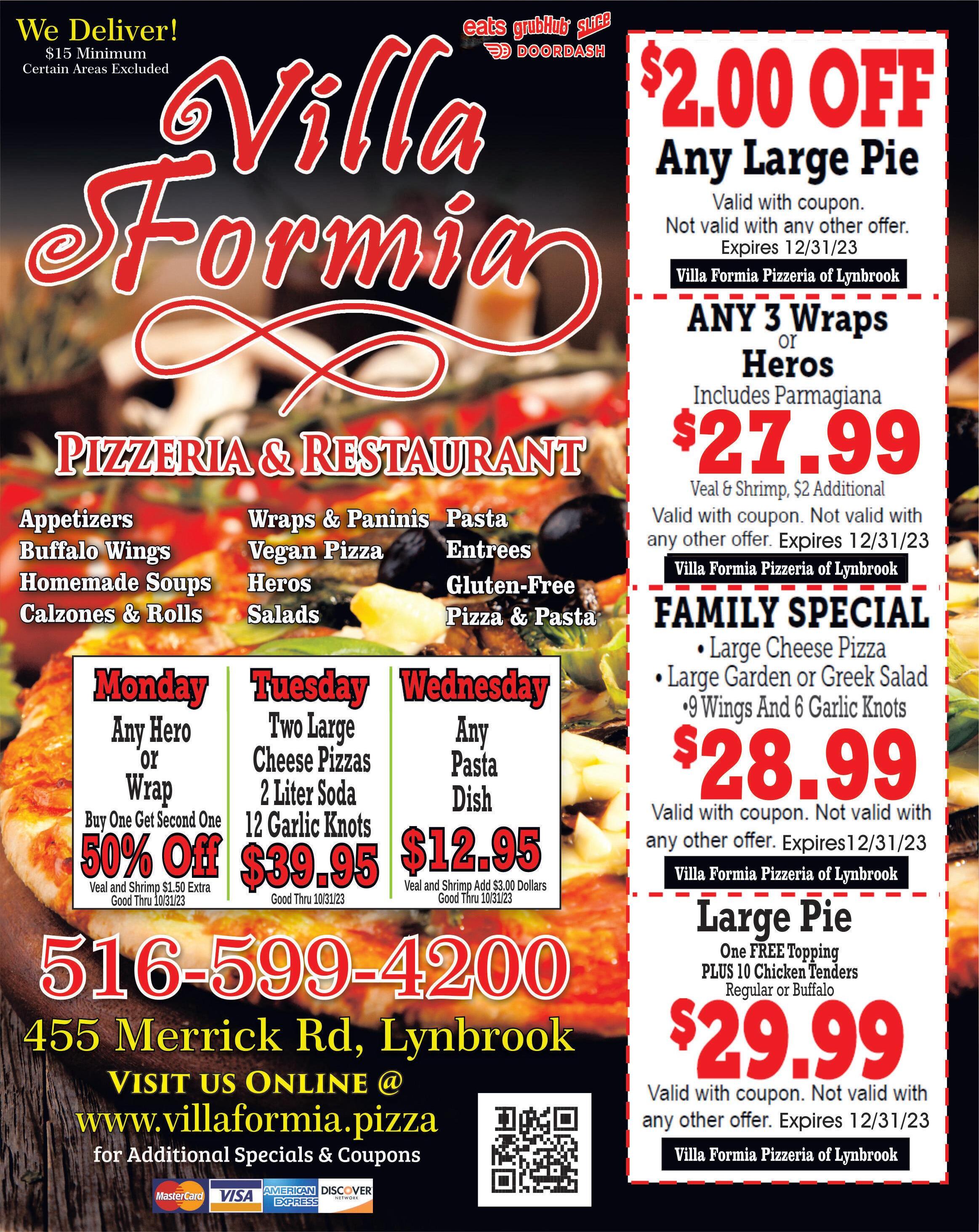 September, 2023 - LI Prime email: info@liprime.com 5 5 Huntington Ave., Lynbrook • 599-2929 • joeyspizzalynbrook.com Joey’s Pizza We deliver to South Nassau County • Minimum Delivery $20. We Accept All Credit Cards - 3.75% Convenience Fee FROZEN DINNERS (OR LUNCH) #1 Baked Ziti #2 Baked Ziti with Meatballs #3 Homemade Stuffed Shells #4 Baked Ravioli #5 Meat Lasagna #6 Chicken Parm w/ Penne #8 Shrimp Parm w/ Penne #9 Eggplant Parm w/ Penne #10 Meatball Parm w/Penne #11 Sausage & Peppers Parm w/Penne #12 Spaghetti w/Meatballs #13 Penne w/Garlic & Oil #14 Penne w/Broccoli, Garlic & Oil #15 Penne w/Spinach, Garlic & Oil #16 Penne w/Meat Sauce #17 Penne w/Sausage #18 (4) Meatballs in Sauce #19 Sausages in Sauce #20 Spinach, Garlic & Oil #21 Broccoli, Garlic & Oil #22 Baked Clams NEW Cheesecake $6 2 pcs $600 each Prices are subject to change without notice. Not responsible for typographical errors. WE DELIvER $5 DELIvERy CHaRgE Full Service Hot Catered Buffet $12 pp +tax Includes: Chicken Parm • Eggplant Parm • Sausage & Peppers • Stuffed Shells • Baked Ziti • FREE TRAY with Each 25 Guests Booked. Minimum of 25 People, Also includes Bread, Grated Cheese, Utensils, Styrofoam Plates, Racks & Stands. PaRT y TR ayS • Chicken Parm • Eggplant Parm • Sausage & Peppers • Baked Ziti • Stuffed Shells (2 Trays) • Lasagna • Meatball Parm • Shrimp Parm With Purchase of 5 Microwave Dinners for $30 $700 + tax LaRgE PIE Pick Up or Delivery PIZZ a SPECIaL 5 Pies $5000 + tax With Delivery $4500 + tax With Pick Up OR TUESDay LaRgE PIE $925+tax ALL DAY - NO LIMIT FRIDay BakED ZITI or 3 for $1200 +tax ALL DAY - NO LIMIT 5 SHRImP OvER PENNE EggPLaNT PaRmIgIaNa W/ PENNE $600+tax $500+tax $500+tax HOT DINNER COmES WITH BREaD WEDNESDay CHICkEN OR EggPLaNT OR mEaTBaLL PaRmIgIaNa W/ PENNE HOT DINNER COmES W/ BREaD$500 ALL DAY - NO LIMIT +tax 8 INCH mEaTBaLL HERO or 3 for $10 00 +tax aDD CHEESE .50 EaCH THURSDay $399 1229979 INFLaTION FIgHTERS EACH$3500 cold + $500 HoT + tax
