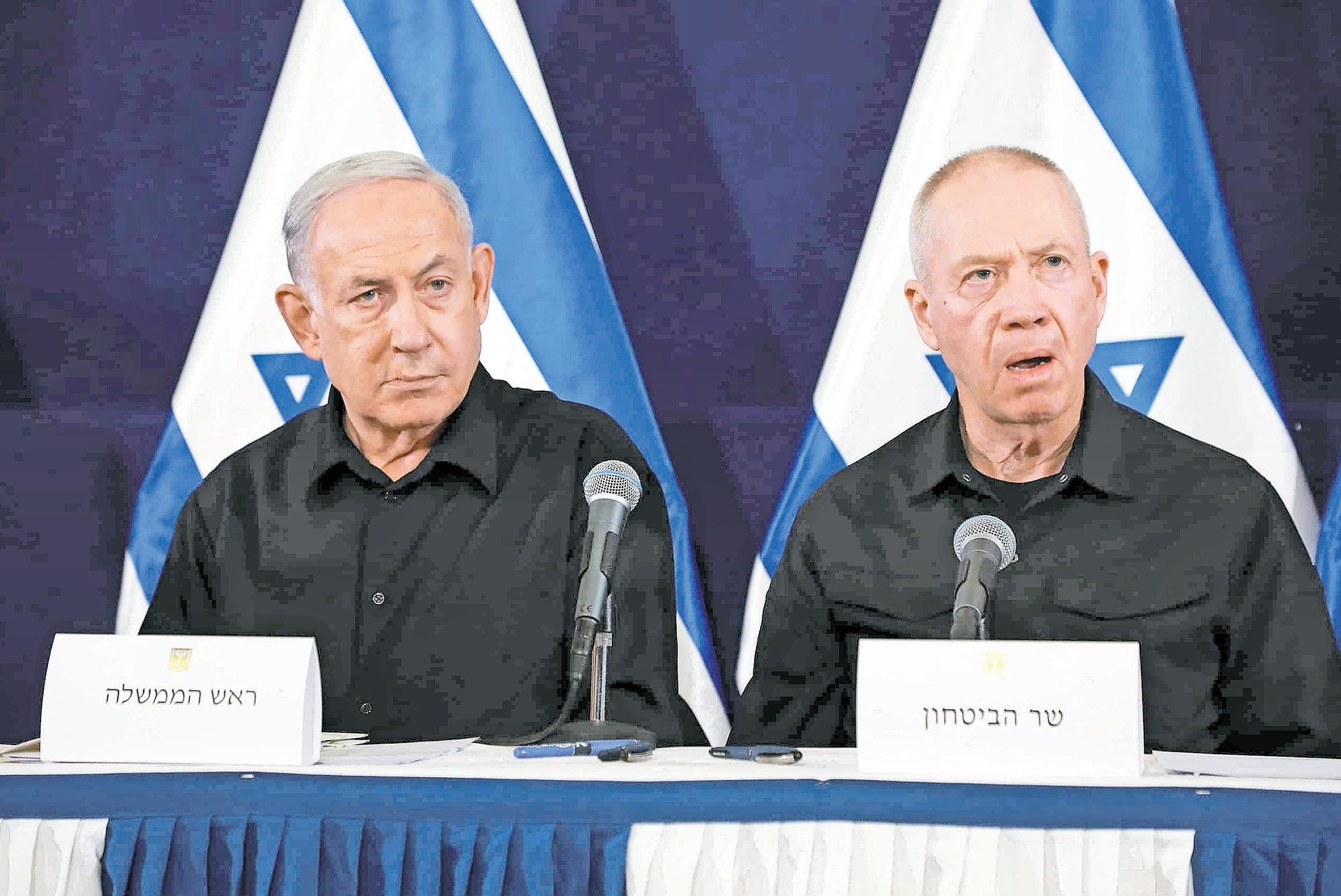 Prime Minister Benjamin Netanyahu and Defense Minister Yoav Gallant hold a press conference at the Ministry of Defense in Tel Aviv, Oct. 28, 2023. Dana Kopel, Pool