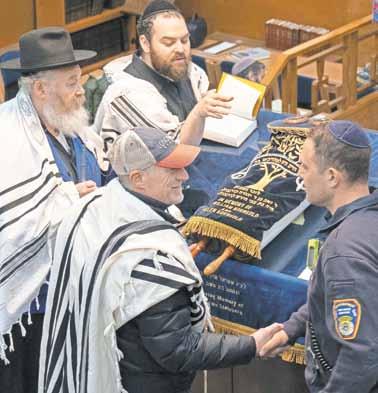 Festivities began with Mincha, where Sam Pinto, Long Beach’s only Jewish professional firefighter, was called to the Torah. He later participated in the ancient tradition of Machazit Hashekel, symbolically counting halfshekel coins to represent the Jewish people.