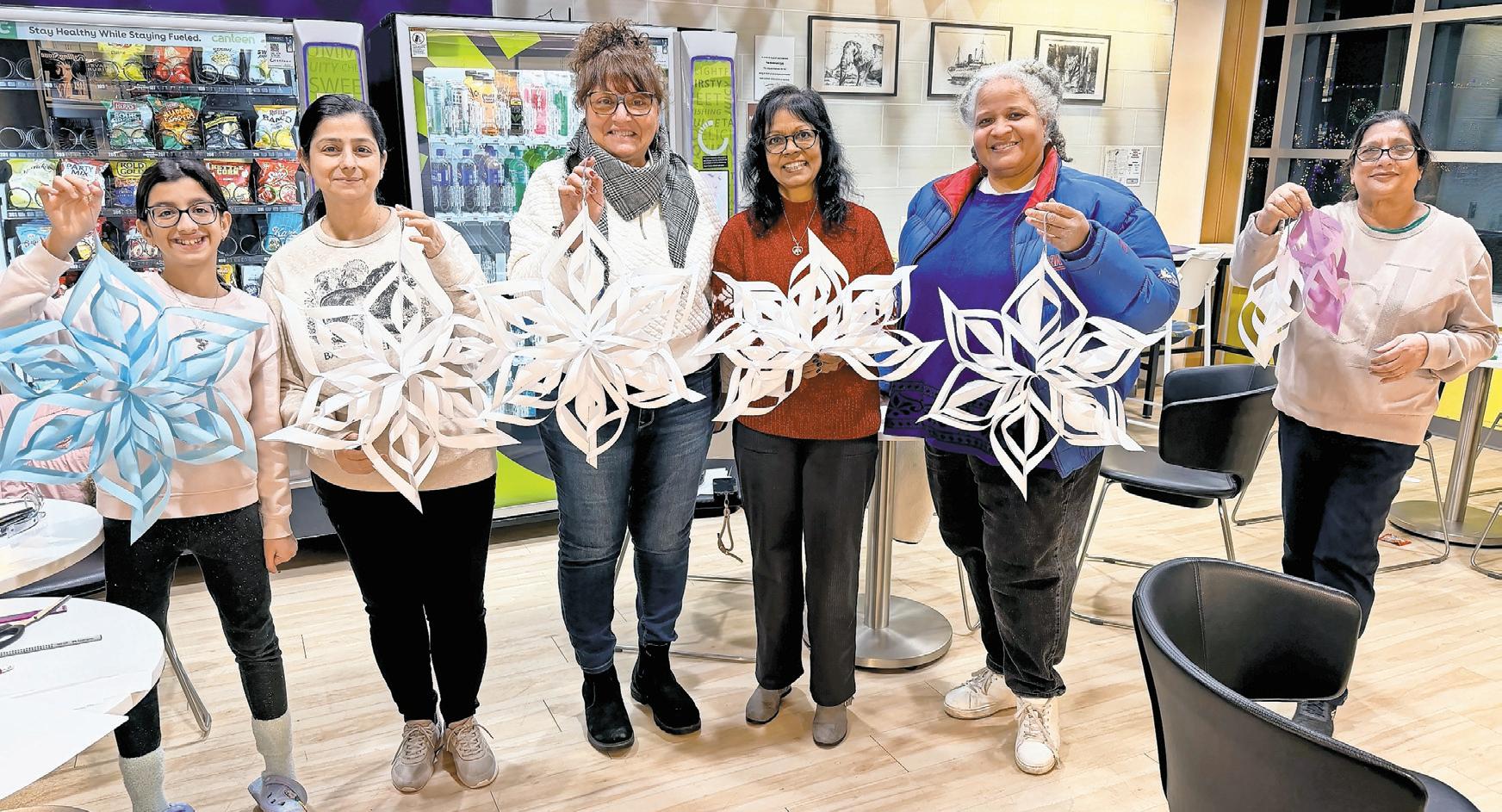 cils. As Sundri demonstrated the process — folding rectangles into squares, trimming them until they become triangles and measuring threequarter-inch slits — she emphasized patience and creativity over perfection. She was joined by members of her family, including her 10-year-old niece, Janiya Sundri, from East Meadow, who proved to be a standout with her confident crafting. While other participants moved methodically through each step, Janiya assembled her snowflake with ease, needing only a bit of help from her mother, Sapna Sundri, Nanda’s sister-in-law.
