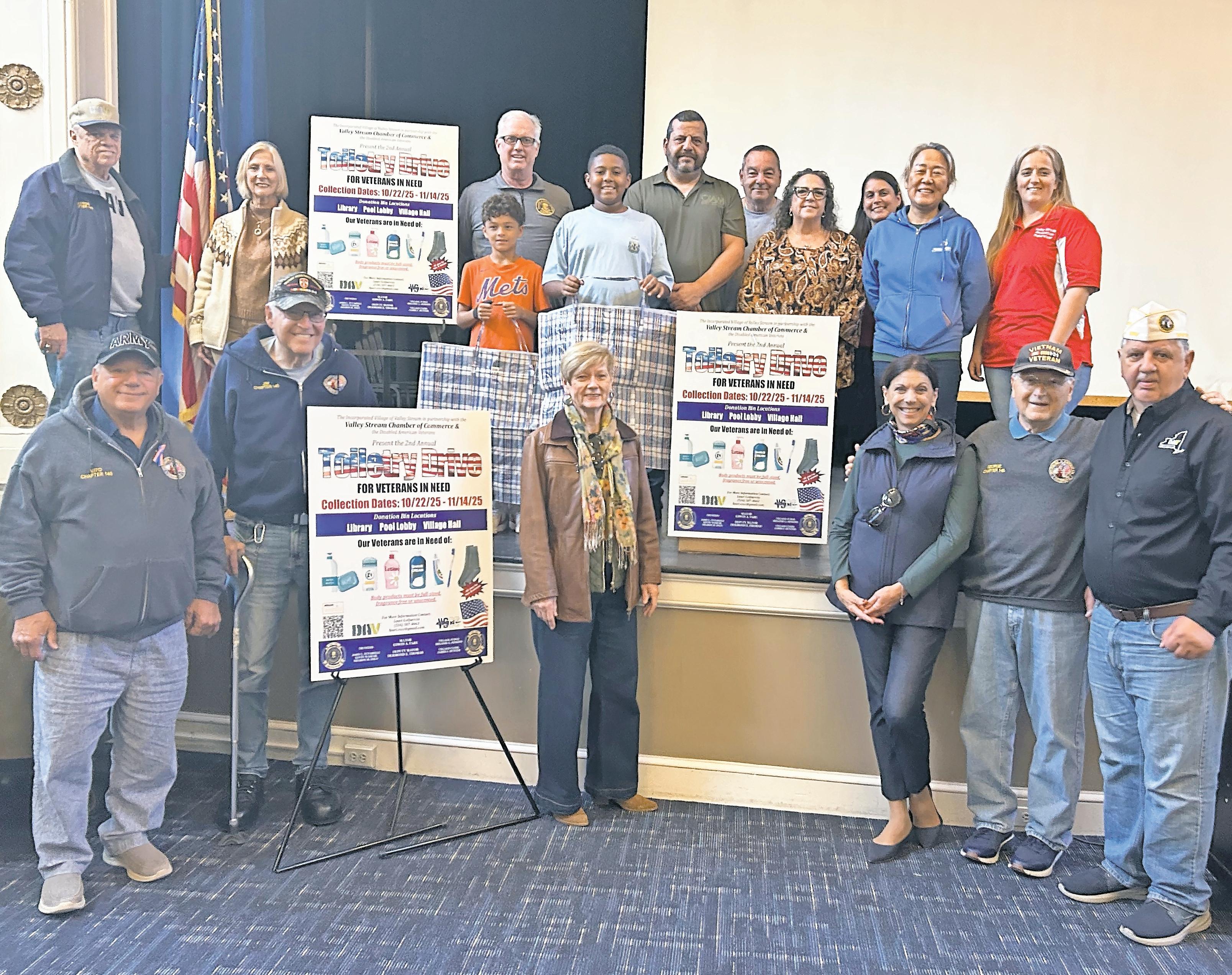 Village officials and members of the Valley Stream Chamber of Commerce are once again joining forces to support local war veterans through a community toiletry drive. Now in its second year, the initiative runs until Nov. 14, and aims to collect basic personal-care items for veterans in need.