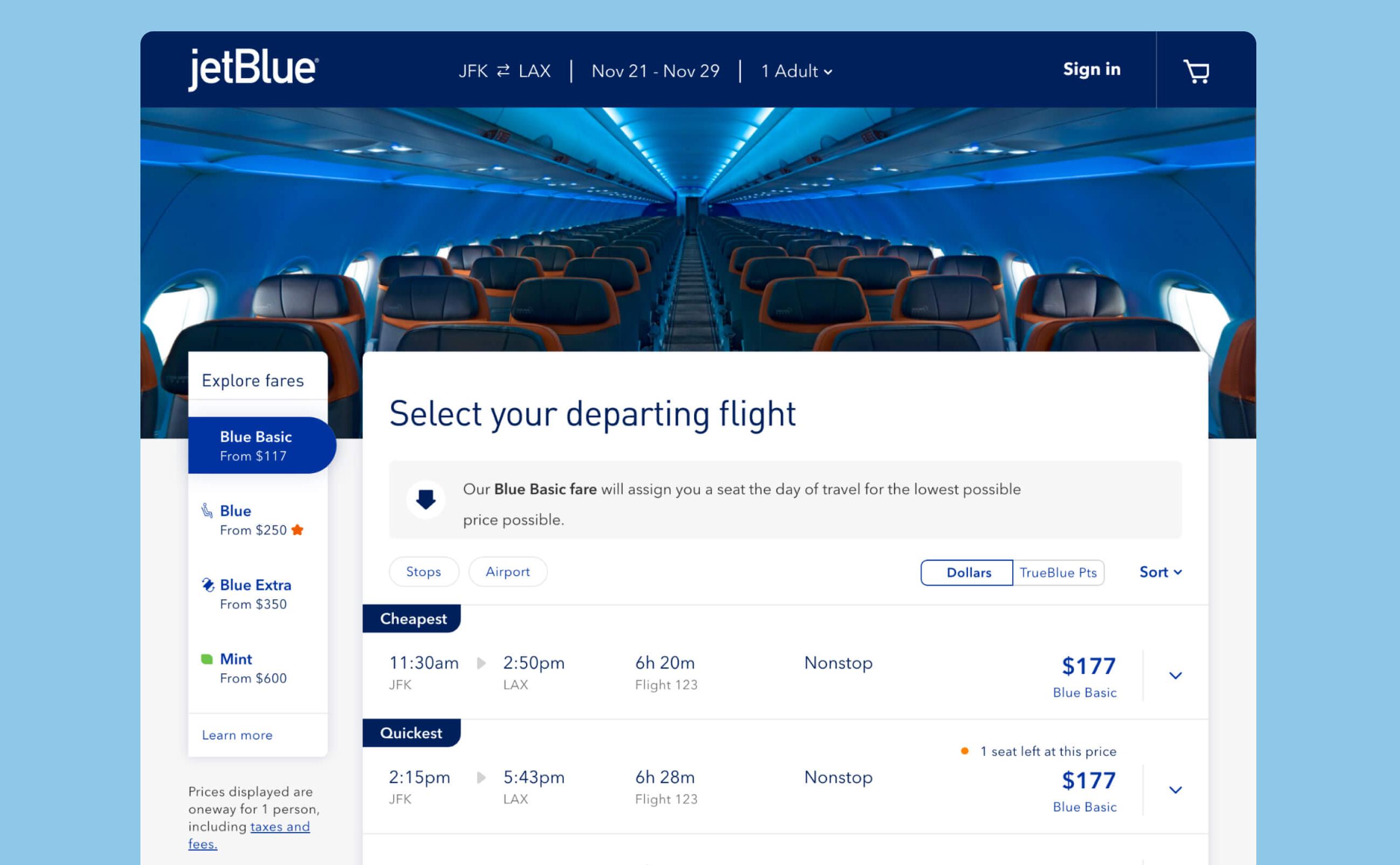 The Low Fare Calendar includes all JetBlue destinations, with prices automatically adjusted to reflect any sales or promotions.