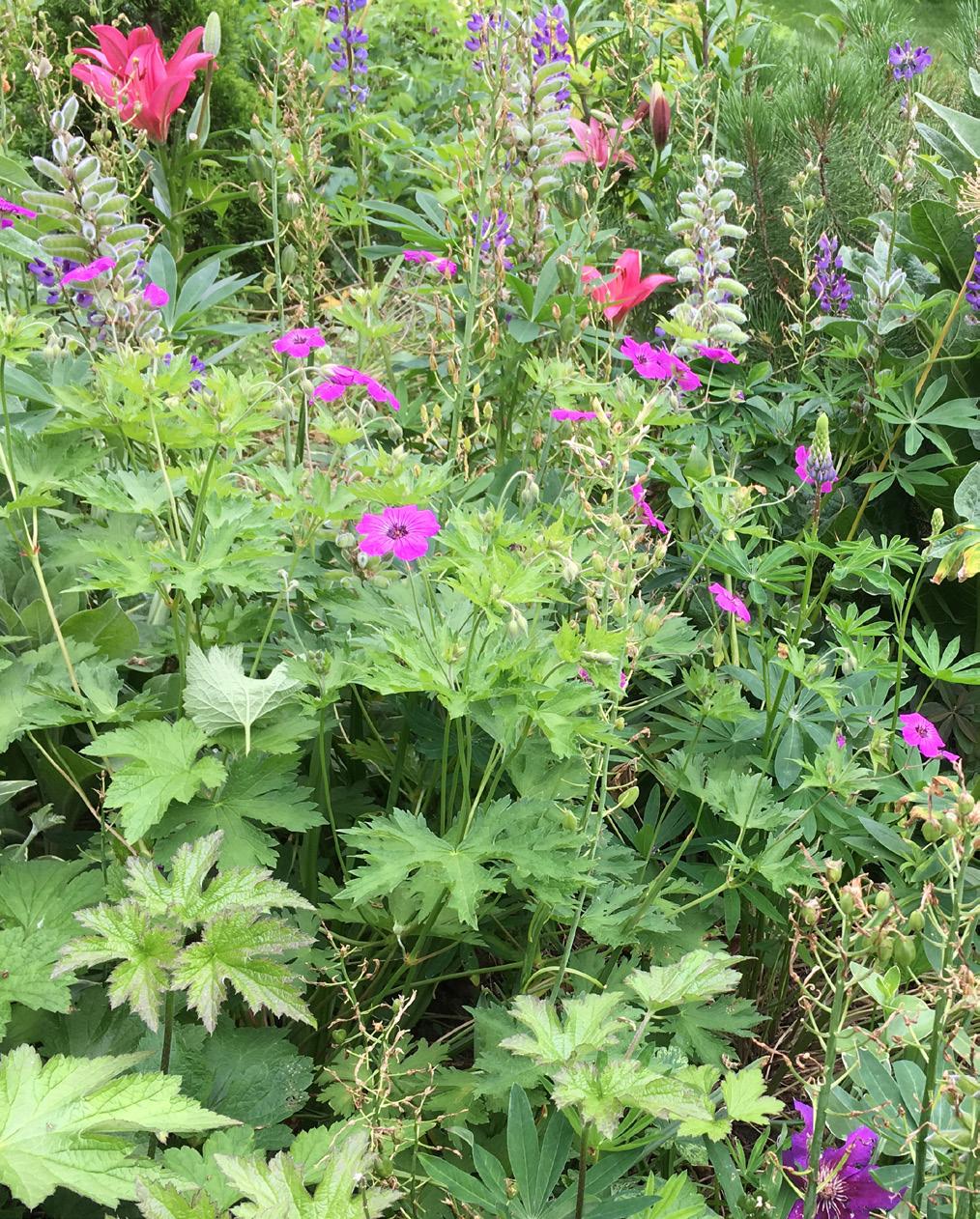 Geranium psilostemon twines its way through Lilium ‘Dani Arifin’, Lupinus perennis, and Clematis ‘Reiman’. Long after the lilies and lupines are finished blooming, the geranium will provide oodles of color.