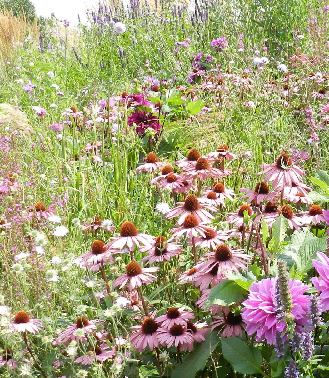 almost triangular heads which begin blooming in July and continue to have a presence in the garden even through the winter, could be planted behind the geranium. With a minimum of plant species, we now have a landscape that has great textural and color contrasts.