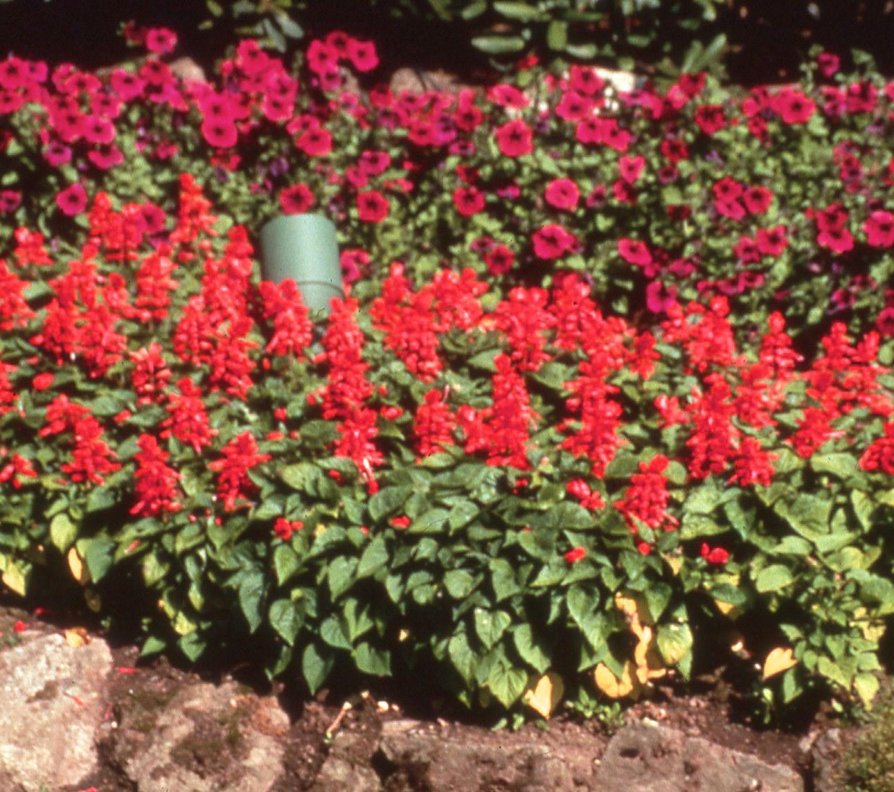 usually short-lived; therefore, it behooves us to include colored foliage as well. Working within this type of color scheme, be aware of the undertones. Nothing will destroy the scene more quickly than clashing undertones. Just look at the photograph of purply red petunias and Salvia splendens, which is an orangey red — very hard on the eyes!