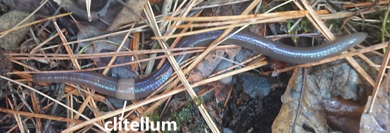 Snake Worm Adult: Note the grayish-brown dark coloration of the body with slight iridescence and contrasting white clitellum located relatively close to the head.