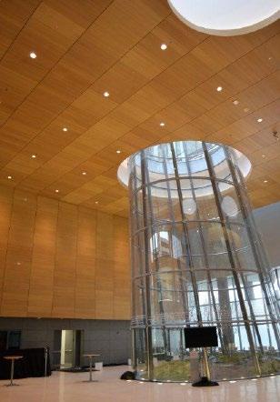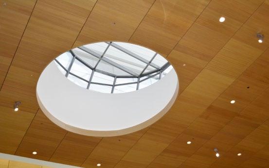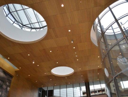 Sandoval pointed to another benefit: “The system is more lenient than what millwork would have been,” he says, noting that there were concerns about the humidity and temperature at the top of the circular atrium where sunlight is allowed in through a skylight. Even there, Ceilings Plus was able to come up with a new idea. Sandoval notes that the company proposed a recessed wood trim that was prefabricated at the factory.