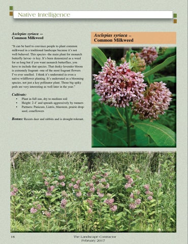 Native Intelligence Asclepias syriaca — Common Milkweed “It can be hard to convince people to plant common milkweed in a traditional landscape because it’s not well-behaved. This species--the main plant for monarch butterfly larvae--is key. It’s been demonized as a weed for so long but if you want monarch butterflies, you have to include that species. That dusky-lavender bloom is extremely fragrant--one of the most fragrant flowers I’ve ever smelled. I think it’s underrated in even a native wildflower planting. It’s underrated as a blooming species, not just a key pollinator plant. Those big spiky pods are very interesting as well later in the year.”