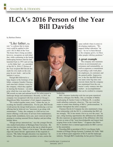 like son,” is a phrase that in many ways could be applied to this year’s ILCA Man of the Year. The honor that is being accorded, however, recognizes an individual that, while continuing in the family landscaping business that his dad launched back in 1951 and serving – as his father had – as a president of the ILCA, 2016-17 Person of the Year recipient Bill Davids has made his own mark on the company he now leads – and on the industry it serves. Though Bill followed to a large degree in the footsteps of his father, company founder Clarence, each man had a distinct vision for the company, which they applied in steering the business – an enterprise which has won more than 200 awards on state and national levels for achievement in landscape design and maintenance. Recently, in 2015, the company was recognized with four awards in Chicago’s Magnificent Mile Association’s Curb Appeal competition. “We worked together many years,” relates the son, in recalling the familial collaboration. For his part, Bill Davids would pursue the design-build process, introducing a service offering that he believed was “necessary to go along with maintenance.” Today, the company is a full-service contractor offering a wide array of services from maintenance, design-build, installation, lawn care, snow removal and tree pruning to creating seasonal flower displays and providing holiday décor. “Design always interested me,” says the younger Davids, who studied horticulture at Michigan State University. He conveys that in a business such as the one in which he grew up – and grew into, “There’s a lot to learn.” He also acknowledges the senior Davids’ appreciation of this requisite to success. “My father thought education was important,” he relates. The current company president, in turn, carries the 10