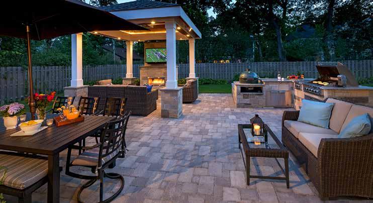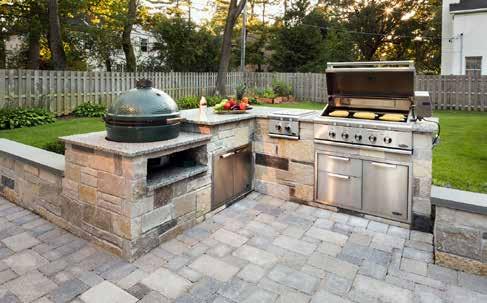 Style, quality, durability, and comfort were achieved through methodical planning, judicious material selection, and expert craftsmanship of all built elements. The design of the pavilion’s vaulted ceiling creates a sense of openness and refinement with honey-stained tongue-and-groove paneling, painted trim, recessed lighting and speakers. The masonry columns, walls, fireplace, and cook station base were constructed on 42” poured concrete footings and faced with a custom blend of seven stone types to replicate the ashlar pattern on the home’s exterior. Bluestone coping was thermal treated to create a pebbled and uniform surface. Gas, power, and signal feeds for the grills, outdoor lighting, sound system, fan, heater, fireplace, and TV were determined in advance and concealed below ground or within each structure. A technology specialist oversaw the expansion of the electrical panel and completed the smart system programming.