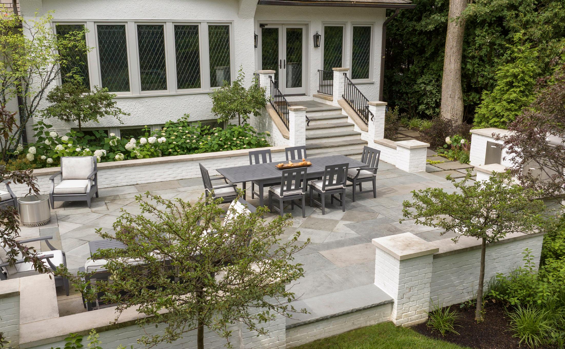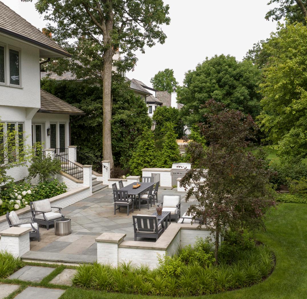 color. The bluestone terrace and outdoor kitchen provide an inviting space for gatherings. Extensive hardscape changes balance functionality and aesthetics. These are also required to meet code guidelines on impervious surfaces. The result is a cohesive, revitalized space for the new homeowners.