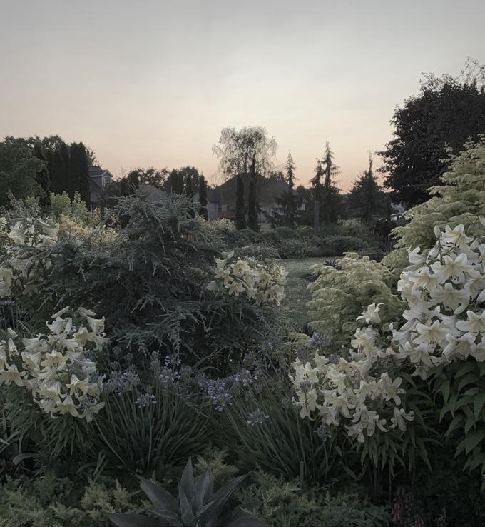 The garden at night is a very different animal. At dusk, those vibrant flowers in red, orange, blue and purple fade from view. White and pale yellow blossoms and silver foliage become the stars. As the sun sets, the garden is transformed into something.