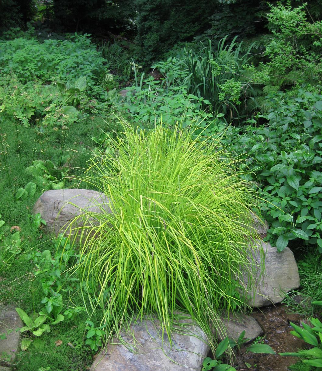 rity, reaches almost 30 inches tall and wide. Interestingly, if you look closer at the foliage, individual leaf blades are thinly margined in green. Listed as hardy in Zones 5-8, I’ve also had consistent success in Zone 4 garden situations. The key to placing this colorful sedge is providing wet soils and avoiding any situations where the soil will dry out. This sedge is not drought tolerant. However, it will tolerate full sun in damp conditions and is equally happy in part shade. In deeper shade it “reads” as a dull chartreuse and tends to be a bit floppy so do give it some sunlight!