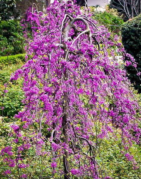 ‘Ruby Falls’ was introduced in 2009 by North Carolina University. Her parents are ‘Covey’ and ‘Forest Pansy.’ Her grandparent is the species Cercis canadensis, which is native to New England and grows from southern Ontario to northern Florida. I like to plant low-growing perennials or dwarf ornamental grass or an evergreen ground cover around the base to highlight the tree. Initially, this was not an easy tree to find, but as it gains popularity, it is becoming easier to purchase.