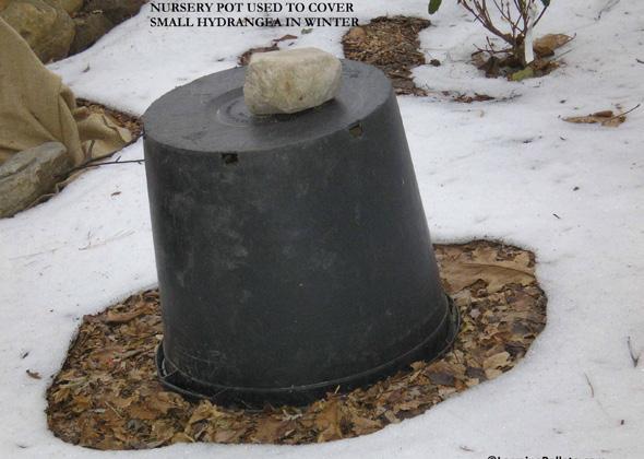 For exposed sites, erecting some kind of windbreak from prevailing weather might change blooming habits. Consider moving your plants to an area with natural winter protection. Think about locations that have persistent winter foliage, e.g., azaleas, rhododendrons, conifers, beeches, oaks, and parrotias. Look up: The value of overhead, winter-persistent foliage can’t be underestimated. Instead of transplanting, install some of these plants close enough to your hydrangeas to take the brunt of the winter weather without creating new problems of competition for moisture and light. Even densely twiggy deciduous plants like spiraea and forsythia can help your flower buds better survive winter weather. If your plants are small, protect them with nursery pots. Your last option is to move the plants to where they can be shielded with a fence, an outbuilding, a shed, a neighbor’s house, or even something you build. This is especially important for foundation plants that can get whomped by falling snow and ice from overhanging roofs.