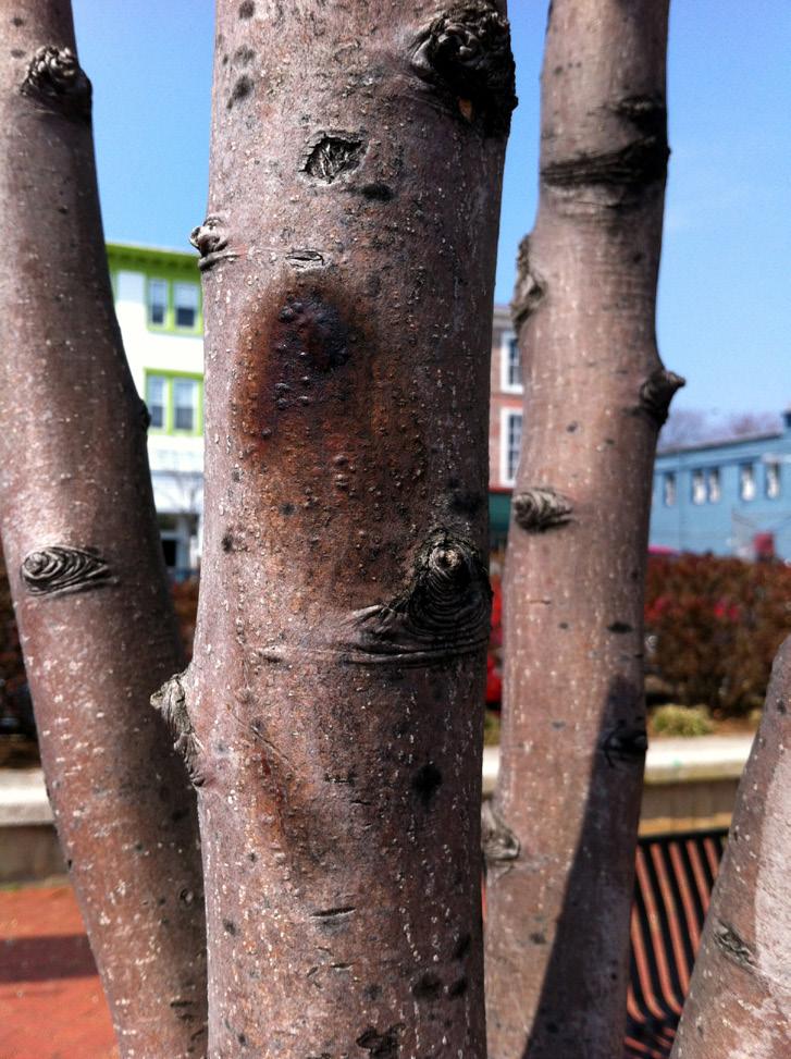 Finally, removing the pathogen itself can help reduce inoculum in subsequent growing seasons. Since the pathogen resides in infected plants, cankered tissue should be removed in winter months, when the pathogen is not active, and destroyed. To move a cankered branch, find the lowest part of the canker, trace the branch to its point of attachment, and cut at the next branch juncture. In the case of large cankers on trunks, scrape down the bark around the canker to the cambium. Pay attention to wood color as it can be an indicator of infection. Wood directly underneath a canker is usually dead and turns a red color farther out, eventually becoming red flecks. Beyond that, the tissue is healthy.