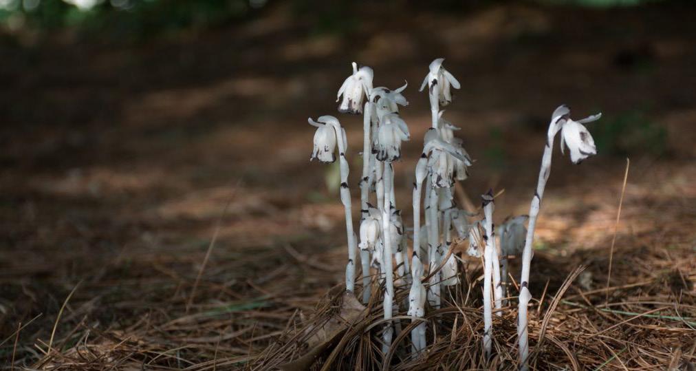 Monotropa uniflora is an extraordinary example of adaptation. It is a parasitic plant that has no chlorophyll, getting its nutrients from nearby plants - such as trees- through the fungal network of mycelium in the soil. It can be an indicator for healthy soil.