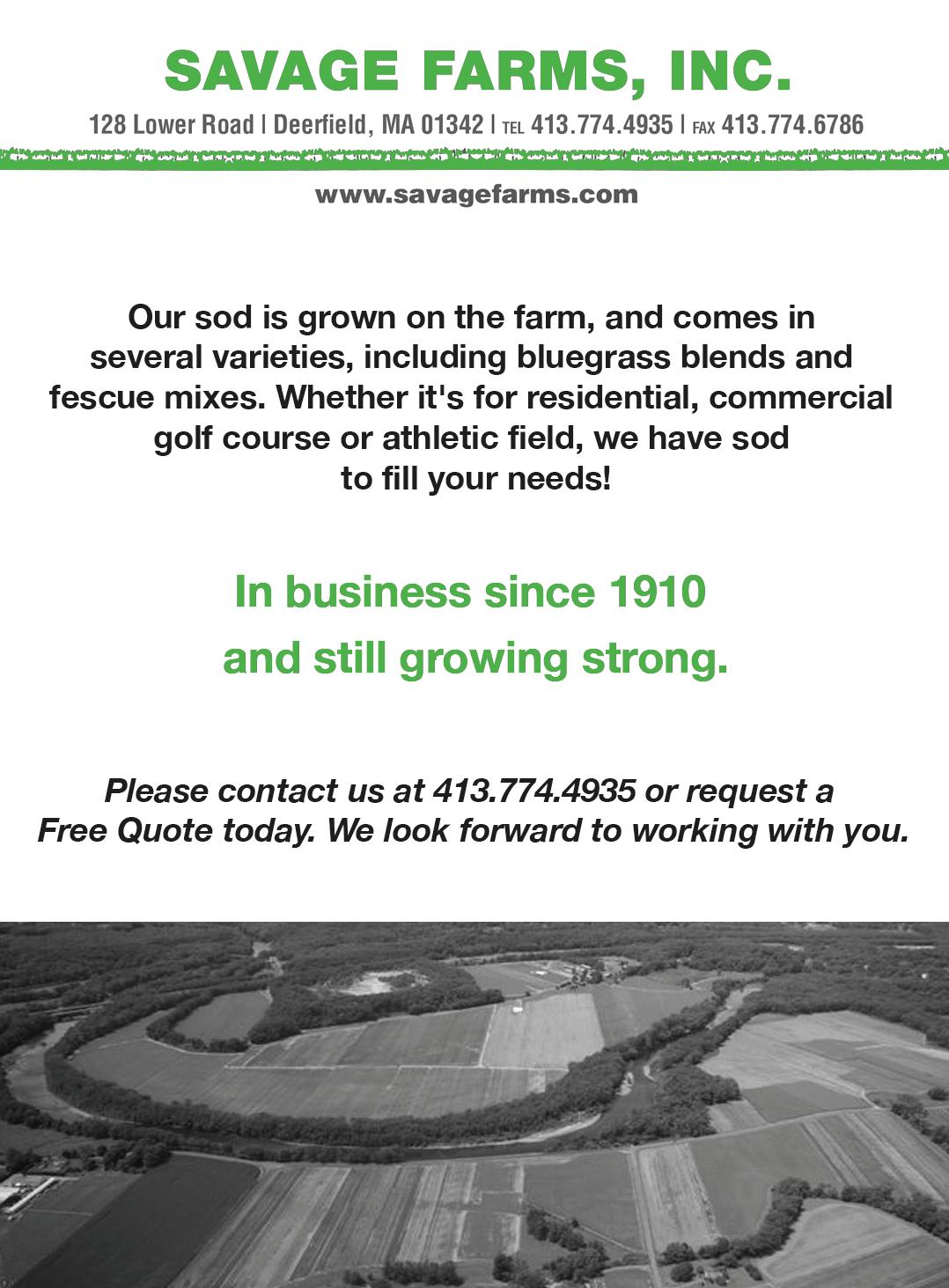 Jay Savage is the President and fourth-generation farmer of Savage Farms, Inc. in Deerfield, MA. Jay’s great grandfather started the business in the current location in 1910 as a vegetable and tobacco farm. His father introduced sod sales in 1963. Today, Savage Farms sells sod, potatoes, and corn in Massachusetts, Vermont, and New Hampshire. They are situated along the Deerfield River and have rich sandy loam soil. They produce sod for landscapers, sports turf, garden centers, golf courses, and the like. They deliver sod all over Southern New England.