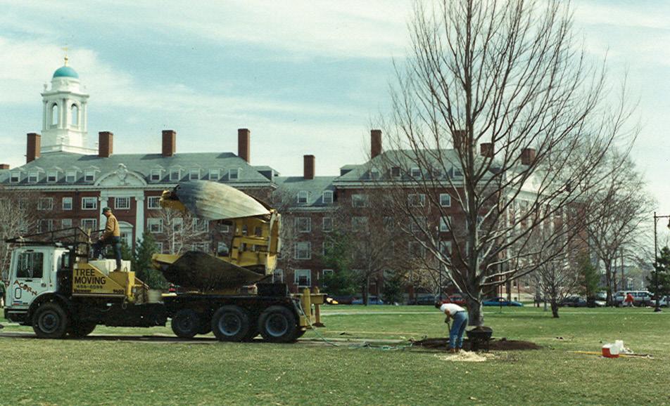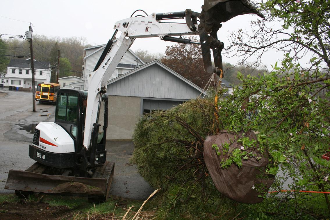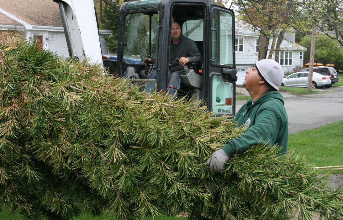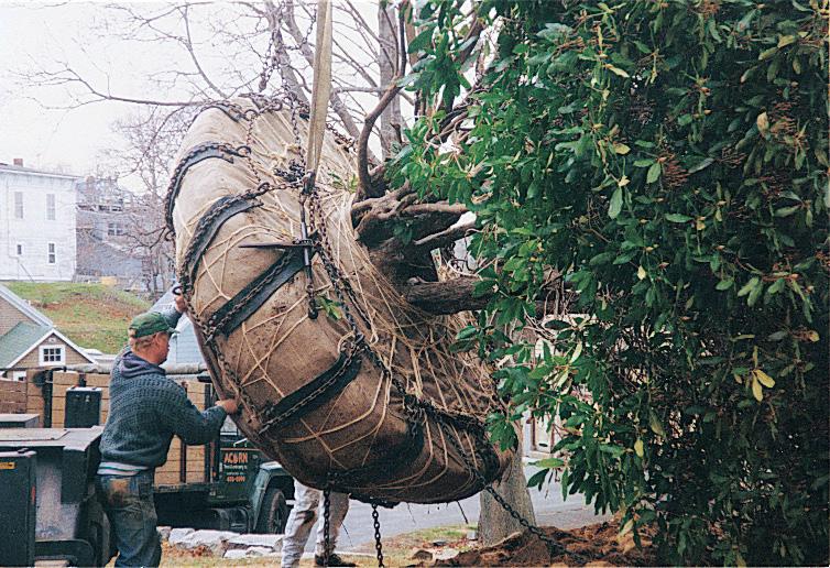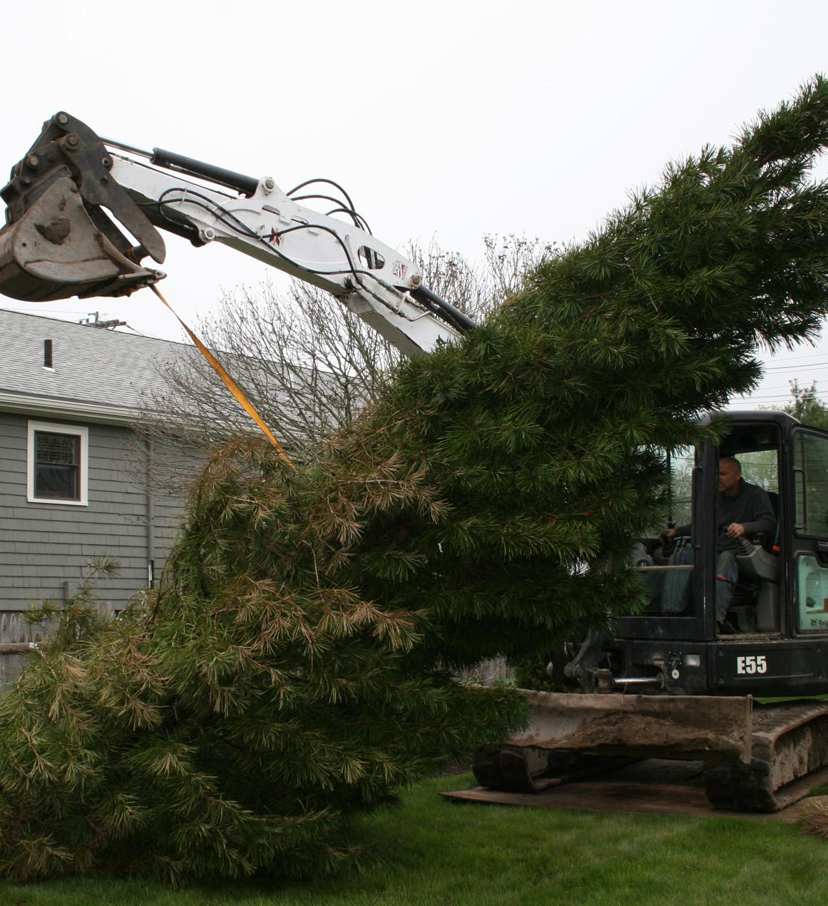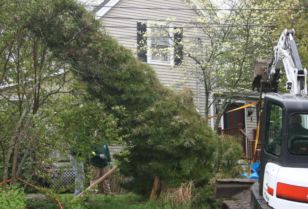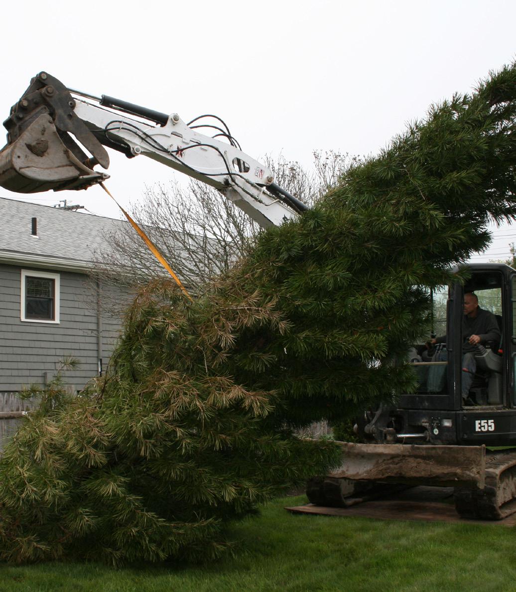 to support an 18-foot tree, loading the big fella for transport, getting it back in the ground in its new home — not to mention that Jean lives in Woburn and I live in Marblehead. Amy’s employer, Ray Bouley of Bouley Landscaping, got caught up in our excitement and provided the crew and equipment to make it all possible.